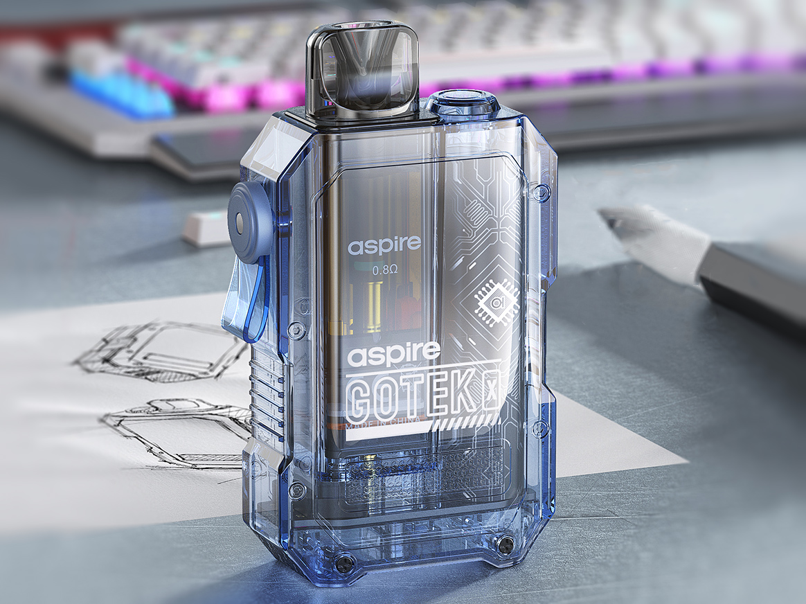 1 сентября в ряде интернет-магазинов появилась портативная под-система — Gotek X Pod Kit, разработанная компанией Aspire. Новому девайсу дали экстравагантный полимерный корпус с прозрачными стенками, обнажающими плату, встроенную батарею и бак. Выбор расцветок ограничили пятью вариациями. Кнопками конструкцию нагружать не стали. Верхнюю площадку увенчали небольшим эргономичным дриптипом. Один из узких торцов снабдили вращающейся петлей для крепления темляка. На дне разместили USB-порт и воздухозаборное отверстие, дополненное ползунком.