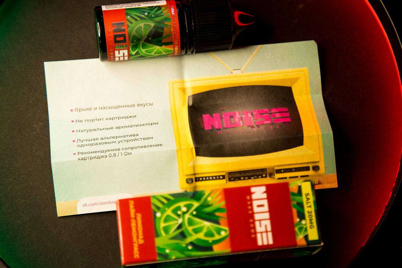 Линейка NOISE Salt поставляется в глянцевых картонных коробках. Цветовая гамма оформления и изображения зависят от выбранного сочетания. Лицевая грань отведена под название линейки, содержание никотина, изображение участвующих компонентов и название вкуса на русском языке. Справа находится информация об объеме флакона с содержанием никотина и дублировано название вкуса, а слева помещен логотип производителя со ссылками на официальные аккаунты в соц. сетях. На обратной стороне расположен информационный блок – описание продукта, состав, предупреждения, содержание никотина, баланс, маркировки, юридическая информация со сроком годности и штрихкод.
