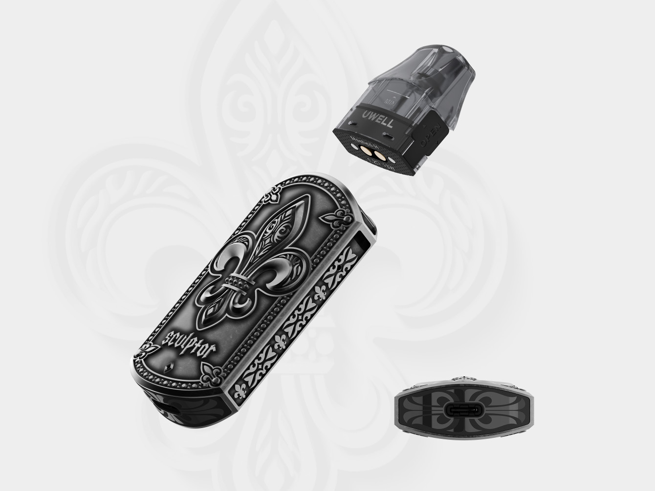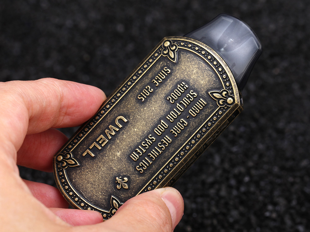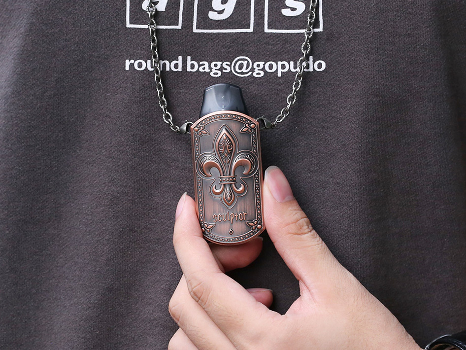 28 сентября в ряде интернет-магазинов появился необычный стартовый набор — Sculptor Pod Kit. Новое устройство получило портативный рельефный корпус, оформленный в оригинальном стиле из цинкового сплава. Фасад украсили крупной геральдической лилией и небольшим логотипом. На противоположной стороне выбили фирменную маркировку. Выбор расцветок разнообразили шестью версиями под различные металлические оттенки. Нагружать кнопками экстравагантную конструкцию не стали. Верхушку увенчали эргономичным дриптипом. Пару верхних углов снабдили петлями для крепления цепочки на манер медальона. На дне разместили USB-порт.
