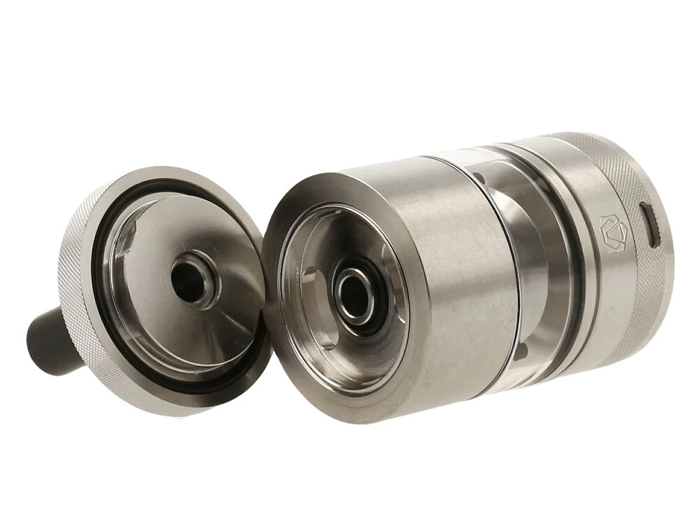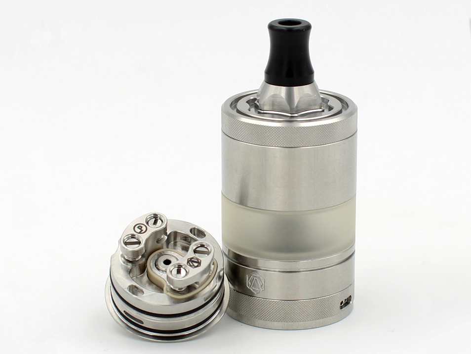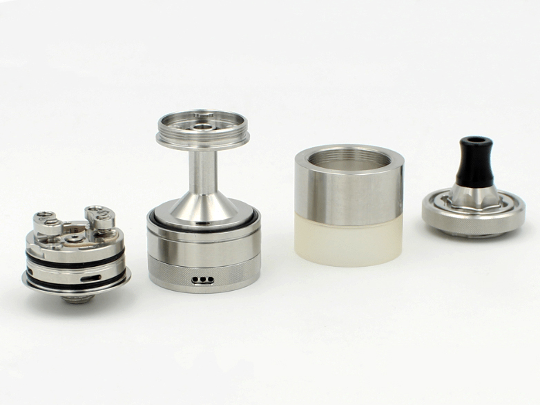 По бокам базы располагаются две широкие округлые стойки с четырьмя слотами для фиксации одной спирали. Ножки намотки устанавливаются в горизонтальной плоскости и прижимаются сверху винтами под прямую отвертку. Воздух падется на спираль снизу, через отверстие в центре деки. Для наибольшей вариативности предусматриваются четыре разнокалиберные вставки — на 1,4; 1,2; 1,0 и 0,8 мм. Помимо того, обдув можно дополнительно регулировать при помощи кольца. Интенсивность подачи жидкости в испарительную камеру настраивается при помощи верхнего кольца. Объем резервуара составит 3,5 либо 2 мл в зависимости от выбранной колбы.
