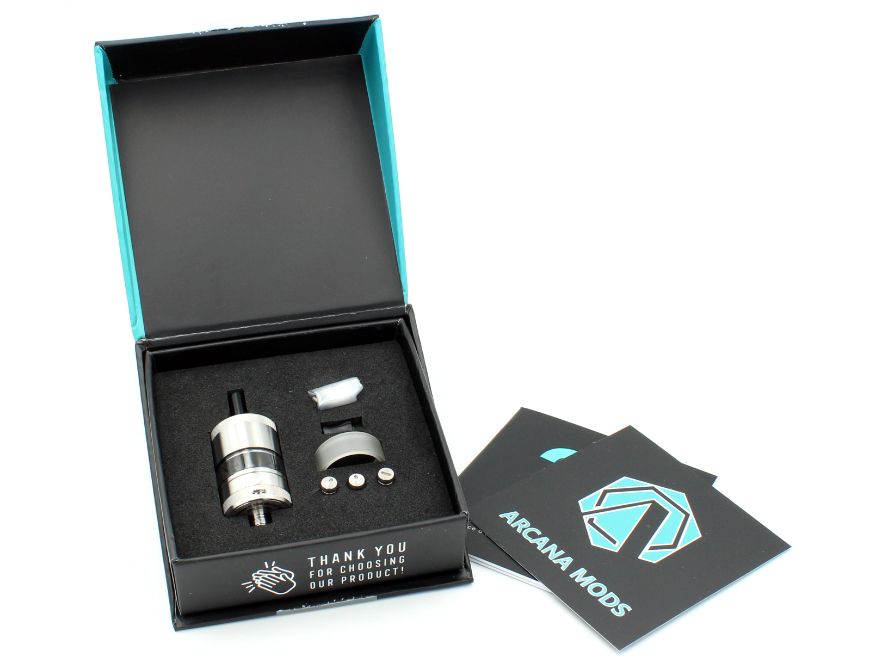 4 ноября компания Arcana Mods анонсировала на странице в фейсбуке новый обслуживаемый бак — Arcana 22 RTA. Устройству дали строгий цилиндрический корпус, исполненный в минималистичном олдскульном стиле из высококачественной нержавеющей стали. Альтернативных расцветок не предусмотрели. Массивную верхушку зафиксировали по системе байонет и накрыли съемным топкепом, скрывающим углубленную заправочную площадку. Дриптип реализовали в двух вариациях под разные затяжки. Колбу изготовили из ударостойкого термопластика. Кроме того, предусмотрели стандартный стеклянный вариант. Основание подпоясали накатанным воздушным кольцом с мелкими перфорациями.