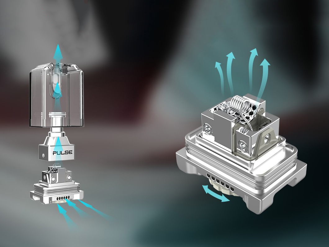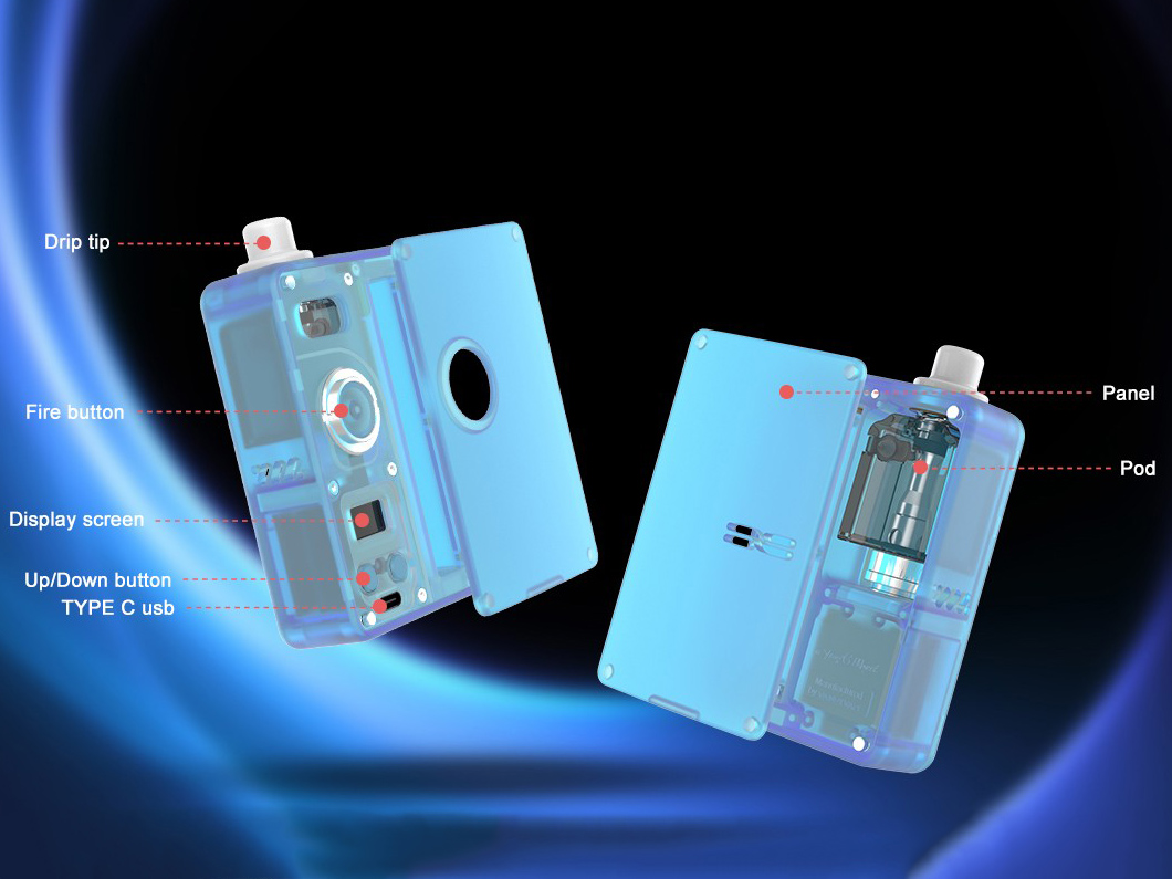 Устройством руководит функциональная фирменная плата, поддерживающая вариативную мощность в пределах от 5 до 80 ватт, варивольт, температурный контроль, а также режимы Smart и Bypass. В качестве источника питания используется внешний аккумулятор формата 18650. Зарядка осуществляется через USB Type-C током в 1А. Картриджи реализуется сразу в двух вариантах — с резервуаром на 5 мл под пять видов сменных испарителей и на 4,6 мл с обновленной обслуживаемой базой под одну спираль. На дне бака предусматривается граненое кольцо для настройки затяжки.