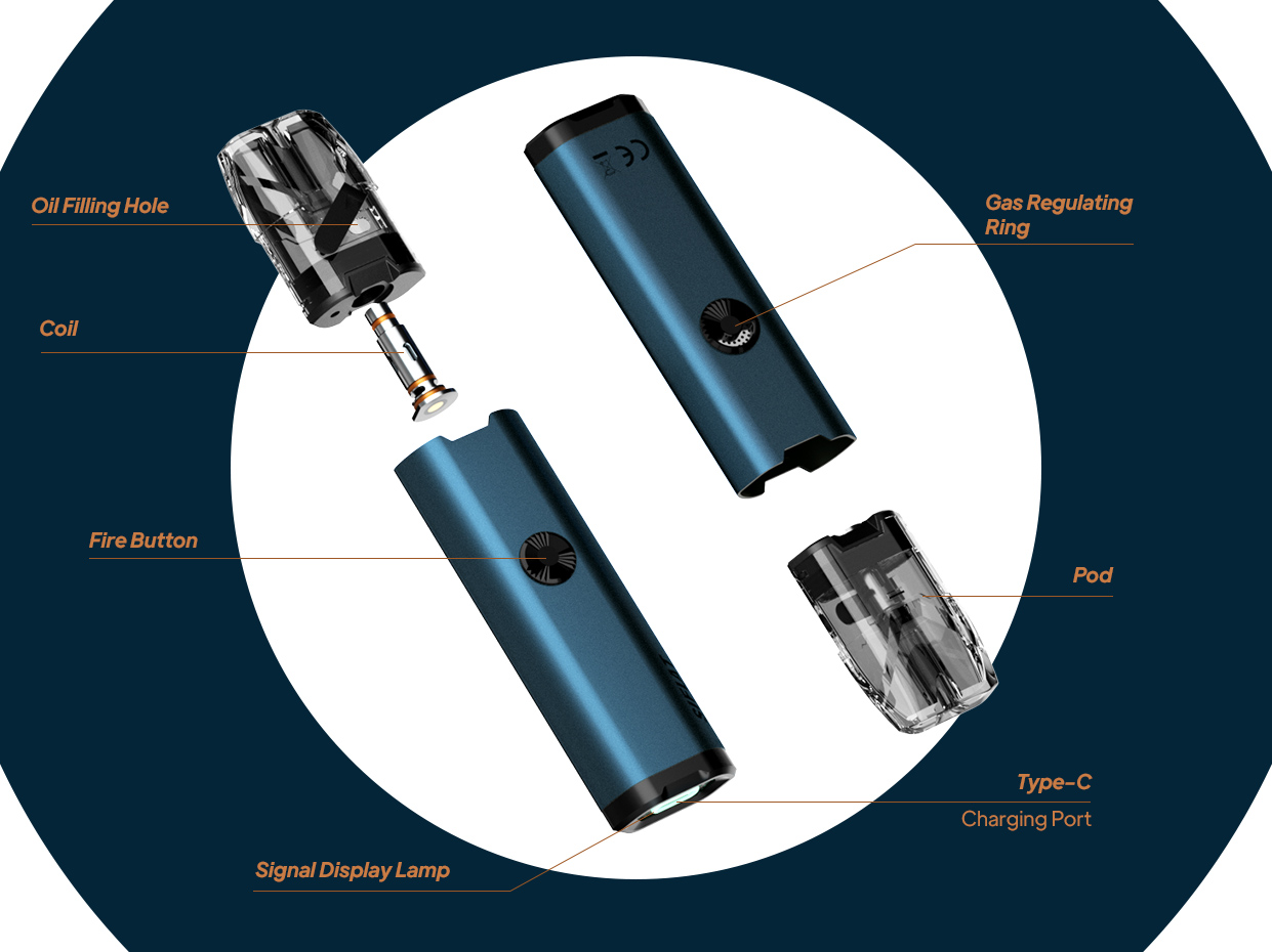 Не смотря на компактные габариты, устройство располагает приличной вариативностью. Выходную мощность можно переключать в пределах трех режимов — 10, 20 либо 30 ватт. Для переключения необходимо зажать кнопку активации на 1,5 секунды и дождаться отклика цветного индикатора. Интенсивность обдува настраивается при помощи вращающегося регулятора на тыльной стороне корпуса. За питание отвечает встроенный аккумулятор емкостью 700 мАч. Картридж работает со сменными испарителями и отличается вместительным резервуаром на 3 мл. Заправка производится через отверстие на торце бака.