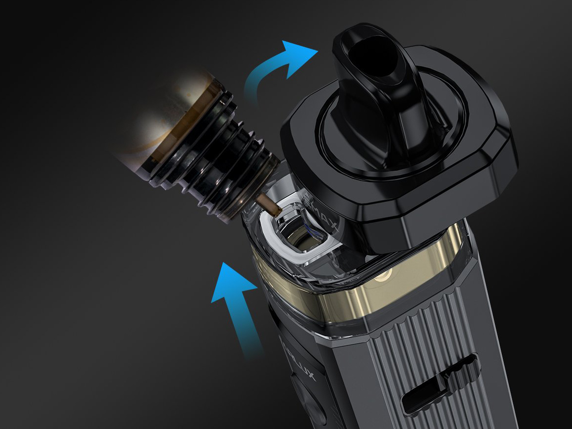 Под-модом руководит незамысловатая плата, позволяющая переключаться между тремя режимами работы. Максимальная мощность составляет 40 ватт. Сопротивление ограничивается диапазоном от 0,2 до 3,0 Ом. Питание обеспечивается интегрированной батарей с запасом в 1400 мАч. Зарядку следует производить через USB Type-C. Режим работы расцветки можно переключать путем тройного нажатия кнопки активации. Съемный картридж комплектуется двумя разнообразными сеточными испарителями из фирменной серии ST с натуральным хлопком и намоткой на 0,35 и 0,5 Ом. Фиксация осуществляется посредством магнитного коннектора. Обдув регулируется ползунком на боковине мода.