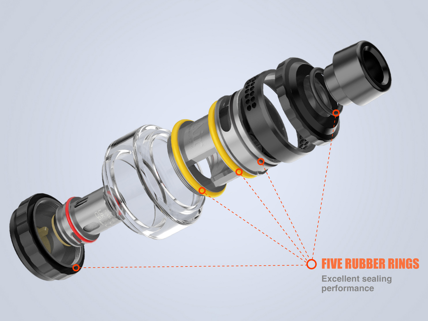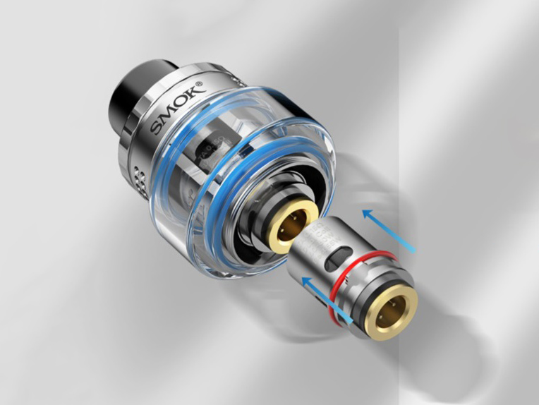 Необслуживаемая база отличается удобной конструкцией, позволяющей осуществлять быструю замену испарителей через дно бака без лишних манипуляций. В запасе предусматриваются два различных экземпляра из линейки TA с сетками на 0,2 и 0,15 Ом. Объем резервуара составит 5 либо 2 мл в зависимости от версии набора. Затяжка регулируется путем вращения верхнего кольца.