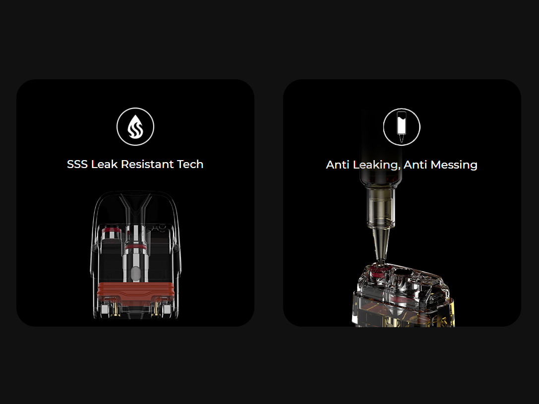 За безопасность минималистичного устройства отвечает фирменная плата Axon chip. Зажигание происходит при помощи воздушного активатора, в процессе затягивания. Питание обеспечивается за счет встроенной батареи с запасом в 1000 мАч. Полный цикл зарядки током в 1А через USB Type-C займет около одного часа. В качестве картриджа используется обновленный экземпляр со стандартной конструкцией, состоящей из резервуара на 2 мл и интегрированного испарителя с сеткой на 0,6 Ом. Помимо того, устройство обладает совместимостью со всеми предыдущими картриджами из линейки Xros.