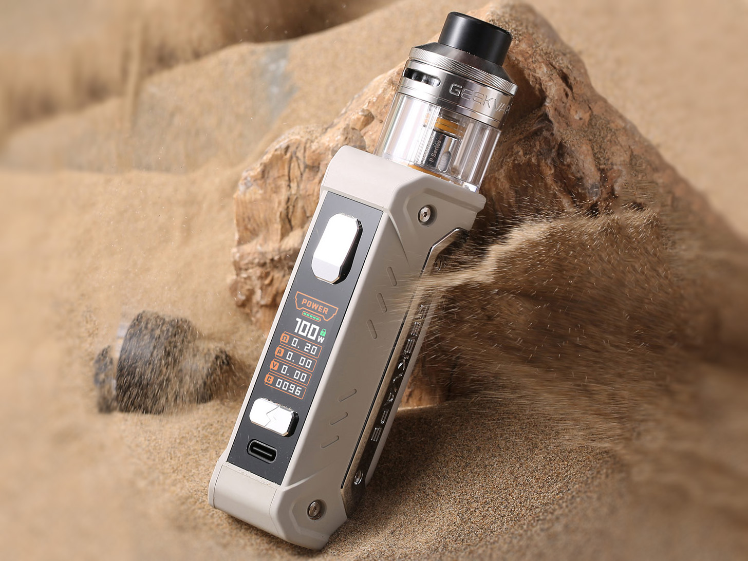 16 декабря компания GeekVape анонсировала на странице в фейсбуке новое устройство — E100i (Aegis Eteno) Kit. Мод обеспечили эргономичным прорезиненным корпусом с не слишком крупными габаритами и традиционной защитой от воды, пыли и ударов по стандарту IP68. Основным материалом для каркаса выступил цинковый сплав. Палитру расцветок разнообразили шестью версиями. Вдоль лицевой стороны растянули глянцевую панель управления с удобной кнопкой активации, цветным дисплеем, двумя клавишами регулировки и зарядным портом с силиконовой заглушкой. Помимо того, на торце установили ползунок, отвечающий за блокировку. Сверху сделали нестандартный коннектор для съемного магнитного картриджа.
