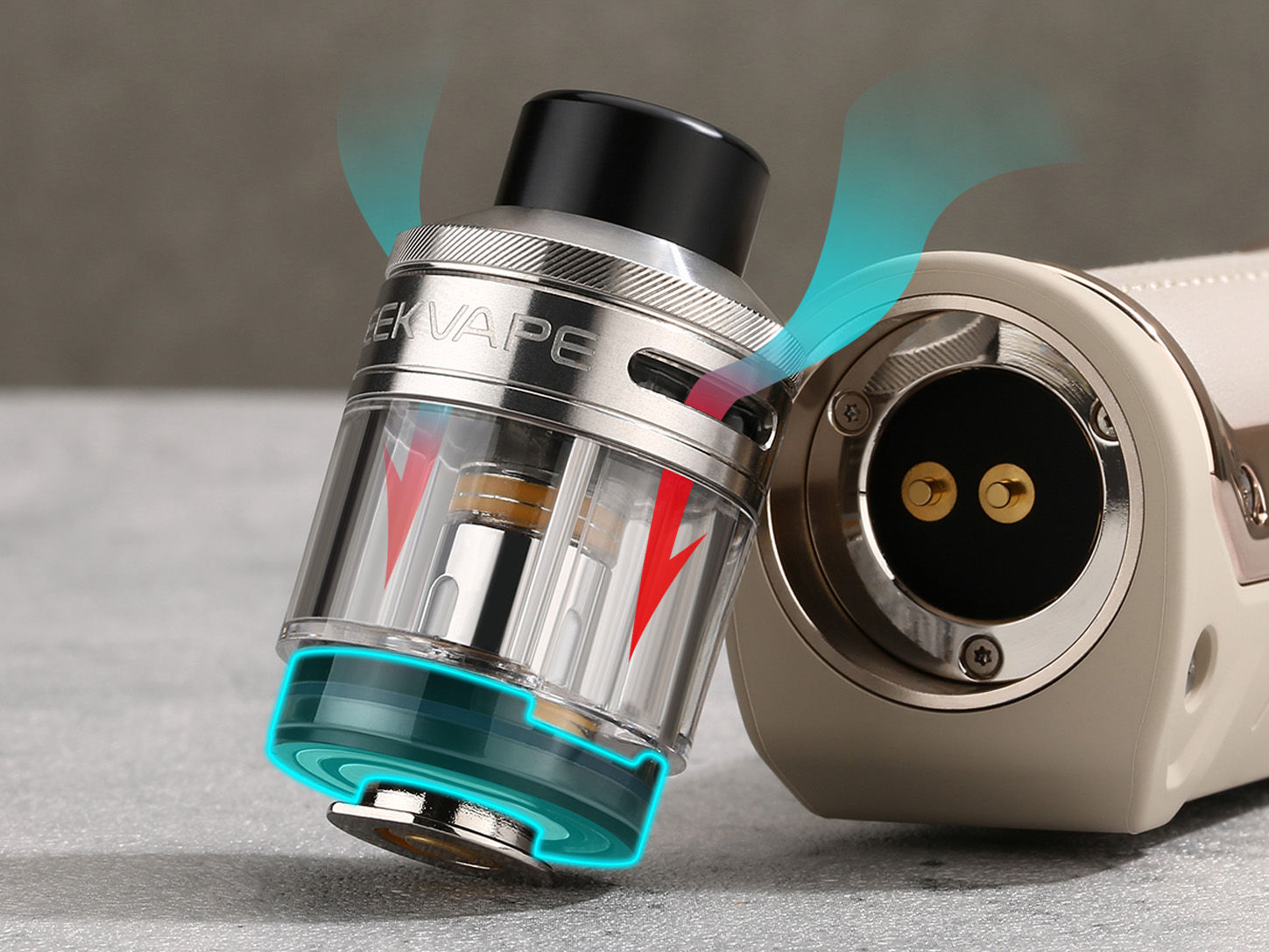 Комплектный картридж обладает герметичной системой обдува с верхним забором воздуха. Заправка осуществляется сверху, через площадку под скручивающейся крышкой. Резервуар вмещает 4,5 мл. На базе располагается предварительно установленный испаритель из линейки P Series с сопротивлением в 0,2 Ом. В резерве предусматривается альтернативный экземпляр на 0,4 Ом.