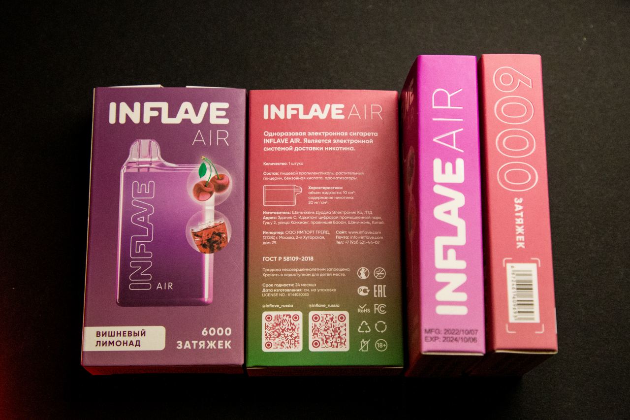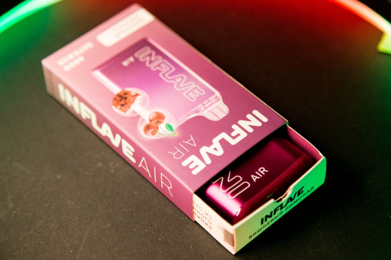 Линейка одноразовых устройств INFLAVE AIR поставляется в матовых картонных коробках с отдельными элементами выделенными лаком. Цветовая гамма оформления и изображения зависят от выбранного сочетания. На лицевой стороне расположено название линейки, изображение самого устройства с ингредиентами микса, название вкуса на русском языке и количество затяжек. На правом торце дублировано название линейки и находится дата производства со сроком годности, а на левом – крупно дублировано количество затяжек и помещен штрихкод. Информационный блок расположен на обратной грани – описание продукта, состав, технические характеристики, юридические данные, предупреждения, маркировки и два QR-кода, один из которых ведет на «инст», а другой на официальный Telegram-канал. На нижней крышке размещено предупреждение на белом фоне, а верхней крышки нет – так как коробка с ящиком пенального типа.