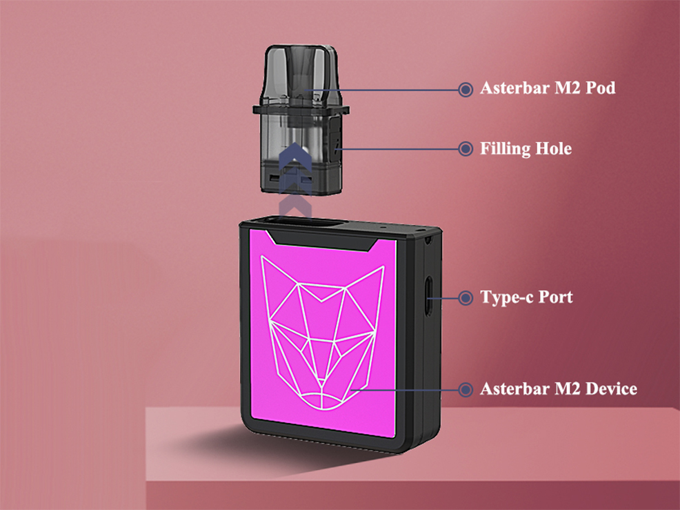 Осенью 2022 года на сайте китайской компании Astebar появилась новая под-система — M2 Pod Kit. Устройство получило лаконичный корпус из термостойкого пластика с угловатым квадратным силуэтом. Незамысловатую конструкцию не стали нагружать кнопками и прочими элементами управления. Сверху предусмотрели небольшую петлю для крепления ремешка. Широкие боковины украсили гравированными цветными вставками, исполненными в пяти расцветках. Одну из узких граней снабдили зарядным портом.
