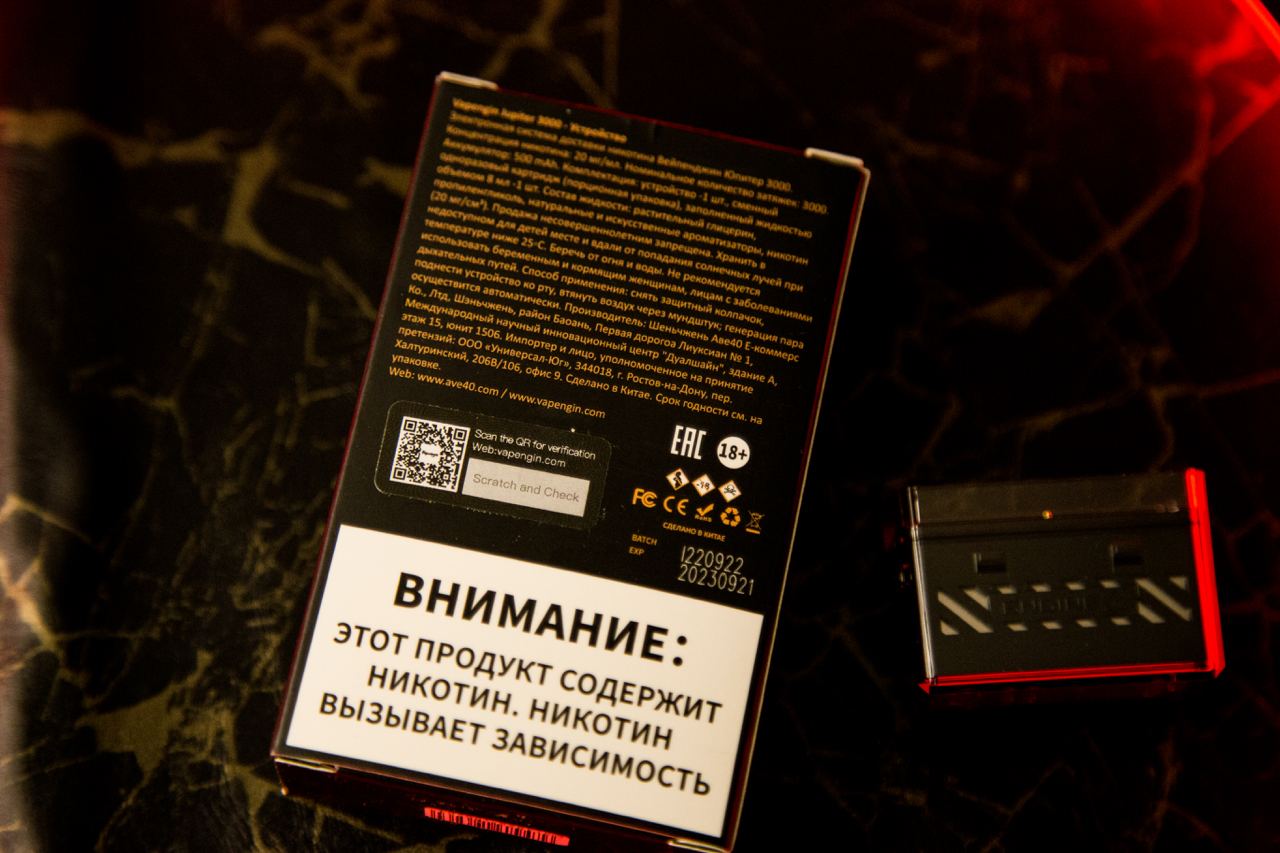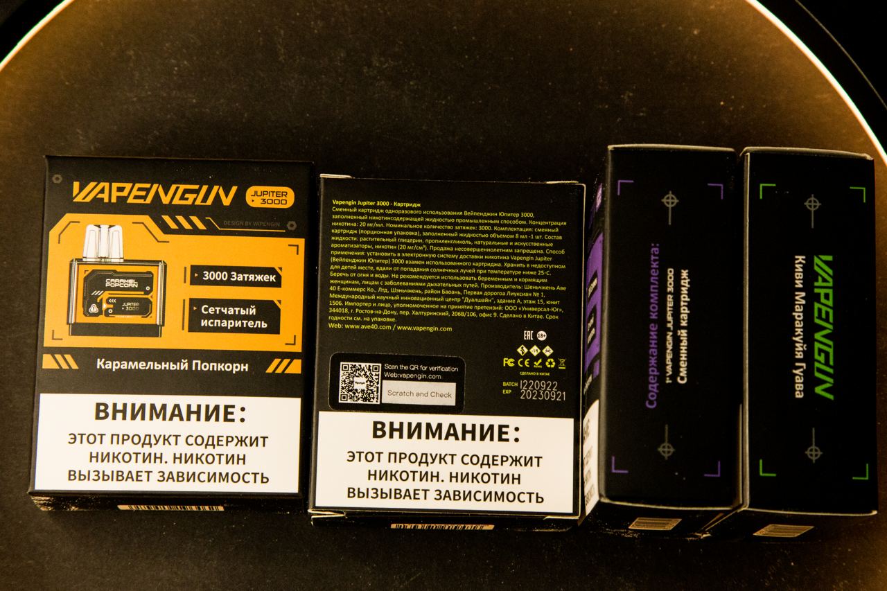 Автор ViVA la Cloud попробовал линейку Vapengin Jupiter 3000. Она включает в себя десять сочетаний в предзаправленных картриджах на любой вкус. Продукт имеет все необходимые документы, а также на него оплачен акциз и НДС — товар полностью «белый».
