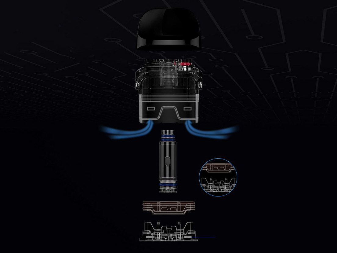Не смотря на компактность, устройство располагает приличной вариативностью — мощность регулируется в пределах от 5 до 25 ватт, активацию можно производить по затяжке либо нажатием кнопки. Кроме того, предусматривается возможность настройки режима работы динамичной подсветки. За питание отвечает встроенный аккумулятор на 800 мАч. Картридж комплектуется двумя сеточными испарителями из серии GX на 0,8 и 1,0 Ом, а также обладает системой защиты от детей. Объем бака составляет 2 мл. Заправка осуществляется сверху.