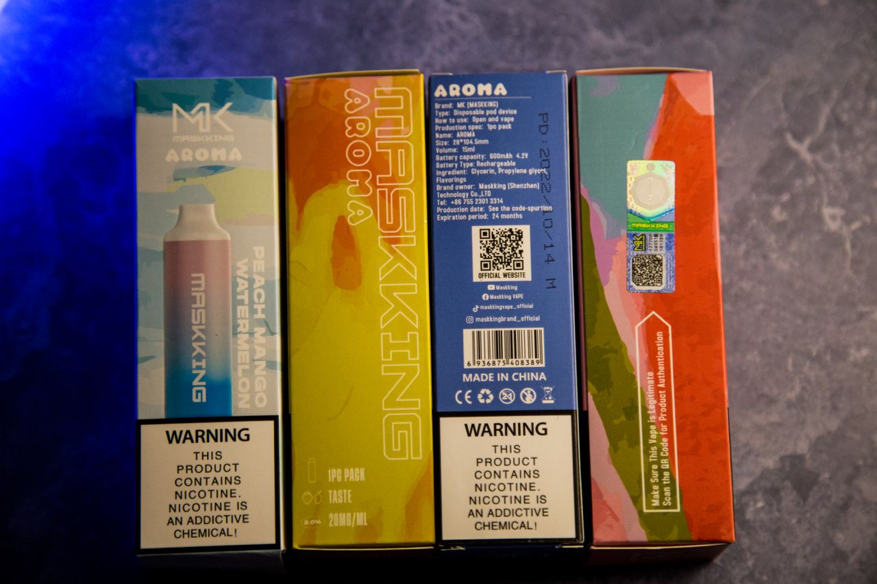 Maskking Aroma поставляется в матовых картонных коробках с отдельными элементами выделенными лаком. Цветовая гамма оформления зависит от выбранного сочетания. На лицевых гранях расположен логотип производителя, название линейки, название вкуса, содержание никотина, предупреждение на белом фоне и наклейка с голограммой для проверки подлинности. С обратной стороны упаковки помещен информационный блок: технические характеристики, состав, юридические данные, срок годности, контактные данные, маркировки, штрихкод и дата изготовления. На верхней и нижней крышке дублирован логотип компании.