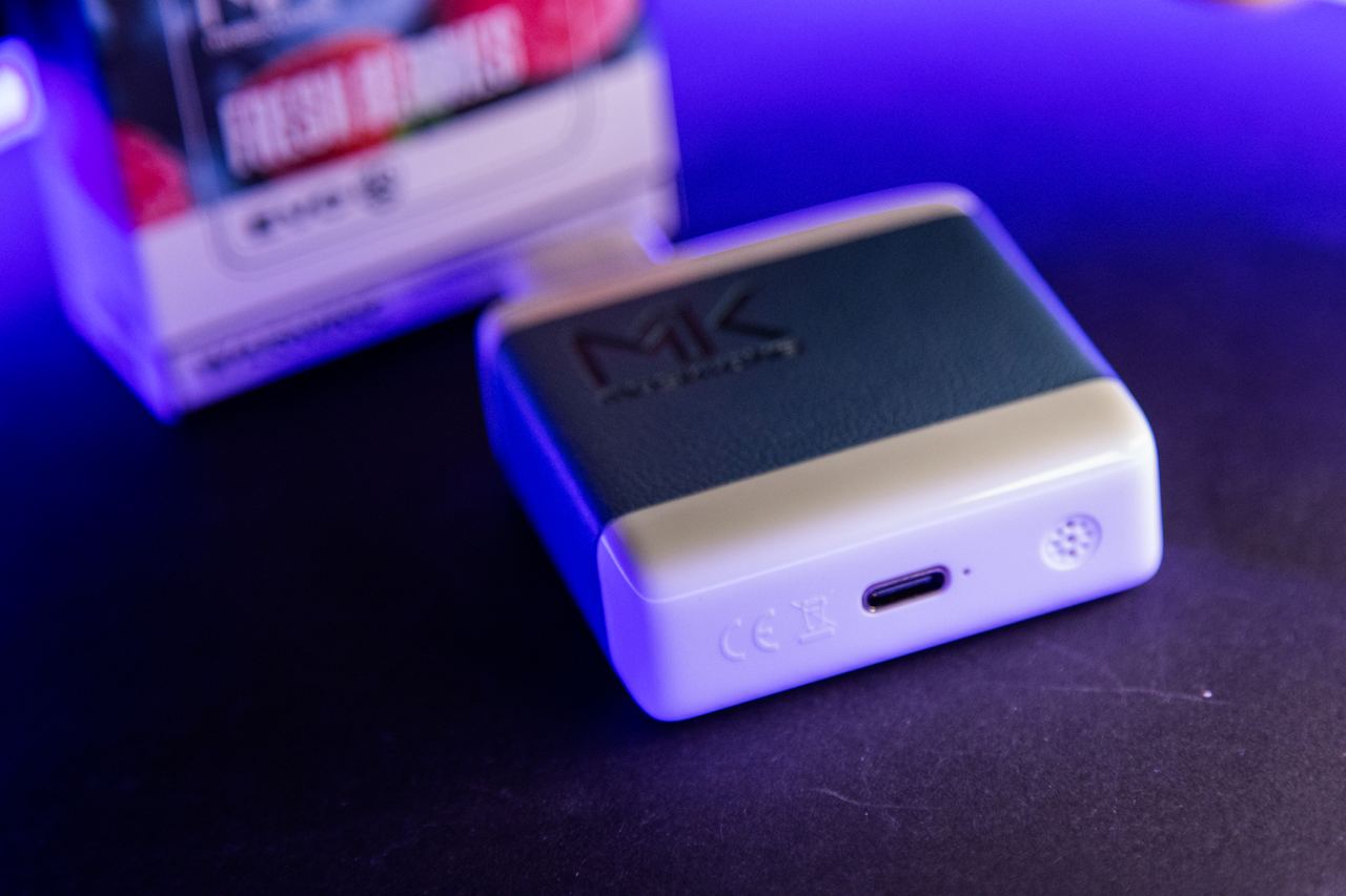 Внутри — девайс в запечатанной индивидуальной упаковке. Устройство дополнительно защищено от загрязнения и циркуляции воздуха силиконовой заглушкой. На корпусе устройства находится кожаная вставка и рельефным логотипом линейки. На верхней части мода располагается отверстие, через которое выходит пар, а снизу — забор воздуха, порт Type-C для подзарядки и световой индикатор, сообщающий об актуальном состоянии устройства.
