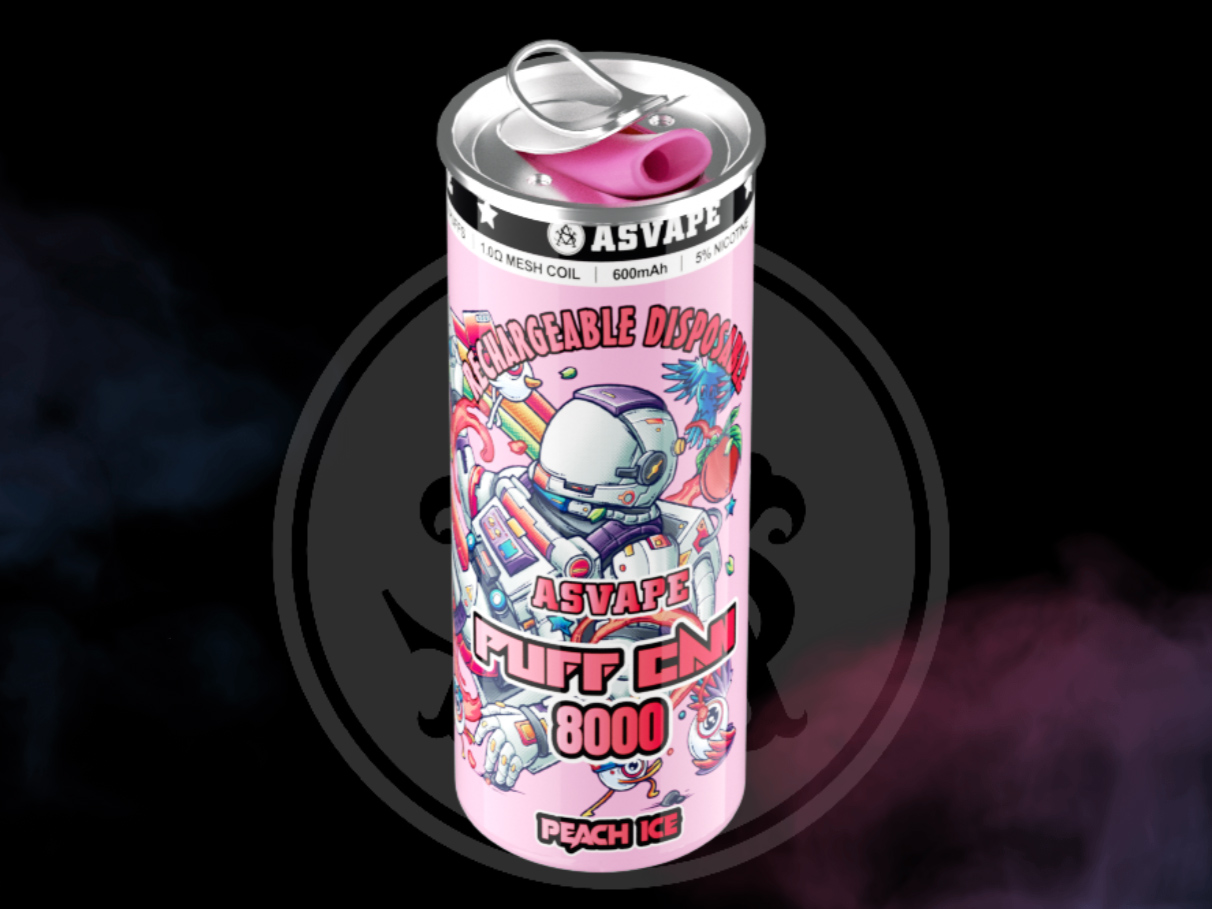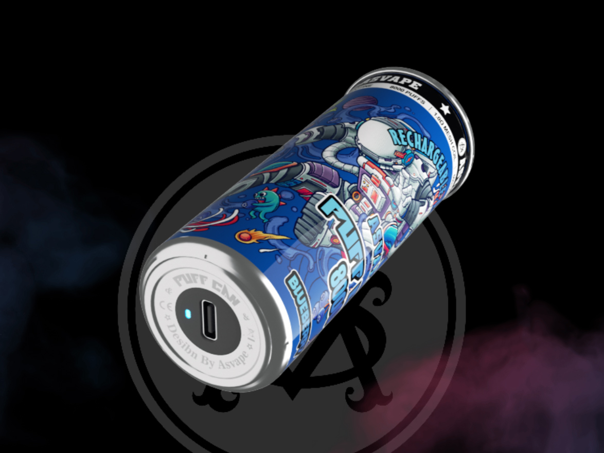 30 декабря компания Asvape представила в инстаграме новое устройство — Puff Can 8000 Disposable Kit. Одноразовый девайс получил нетривиальный яркий корпус, реализованный в виде банки газированного напитка. Вкусовую палитру ограничили четырьмя вариантами — манго, персик, ягодный микс и черника. Каждый экземпляр отличился индивидуальной расцветкой с оригинальным изображением. Сверху, под стилизованной крышкой с замком спрятали эластичный силиконовый мундштук. Дно снабдили зарядным портом и небольшим цветным индикатором.