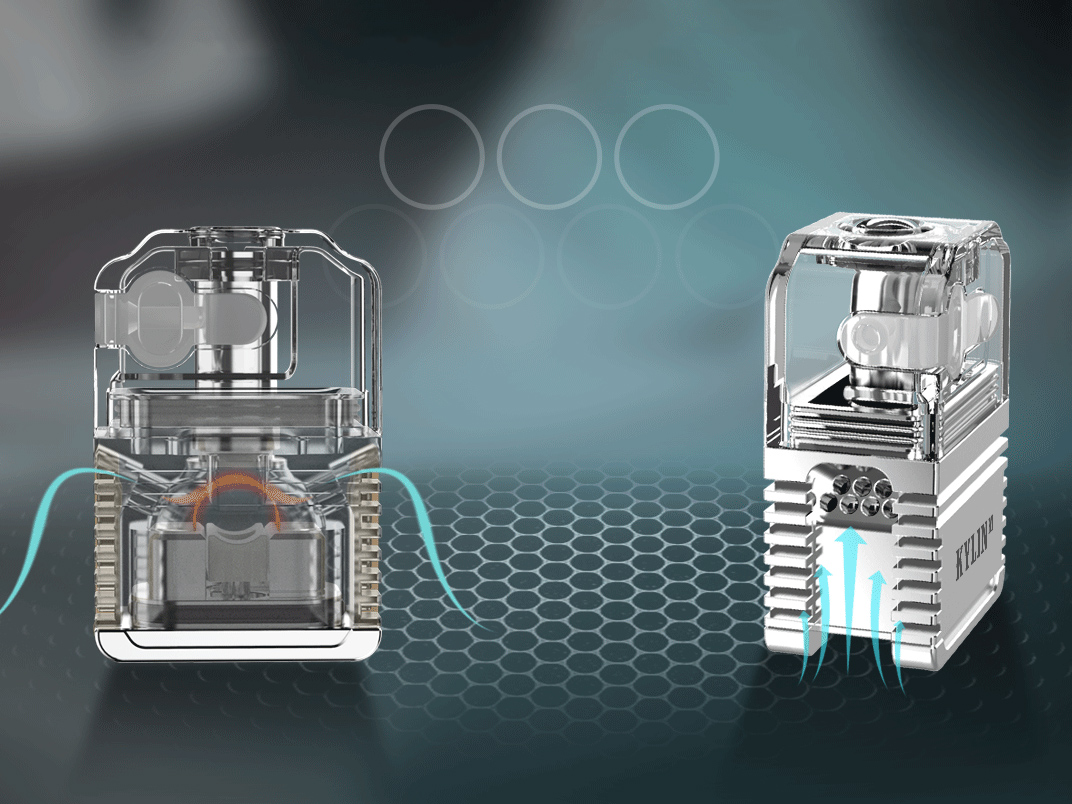 Компанию моду составляет бак Kylin M реализованный в универсальном стиле под моды с отсеками формата Boro и BB. Прямоугольное основание бака изготовили из легкого сплава и дополнили съемной воздушной вставкой из термостойких полимеров. Сверху разместили съемный резервуар из прозрачного ударостойкого пластика. Для фиксации внутри устройства предусмотрели стандартный адаптер 510, фиксирующийся посредством резьбы. Вариативная базу снабдили двумя массивными прижимными пластинами для установки сетки либо спирали. Переключение обдува реализовали посредством сменных вставок. Кроме того, предусматрели картридж с резервуаром на 5 мл под пять видов сменных испарителей