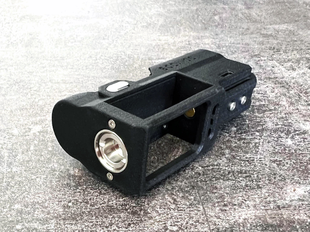 15 февраля в ряде интернет-магазинов появилось необычное устройство — D.Box Boro Mod, разработанное компанией GD Mods. Эргономичный мод распечатали на 3D-принтере из легкого, но прочного нейлона в единственной черной расцветке. Крупный слот под боро-бак увенчали стандартным коннектором под 510-й дриптип. На скругленной тыльной стороне сделали нетривиальный аккумуляторный отсек без крышки. Металлическое дно укомплектовали лаконичным дисплеем. Кнопку зажигания разместили на одном из торцов. Пару маленьких регулировочных клавиш отправили на узкий фасад.