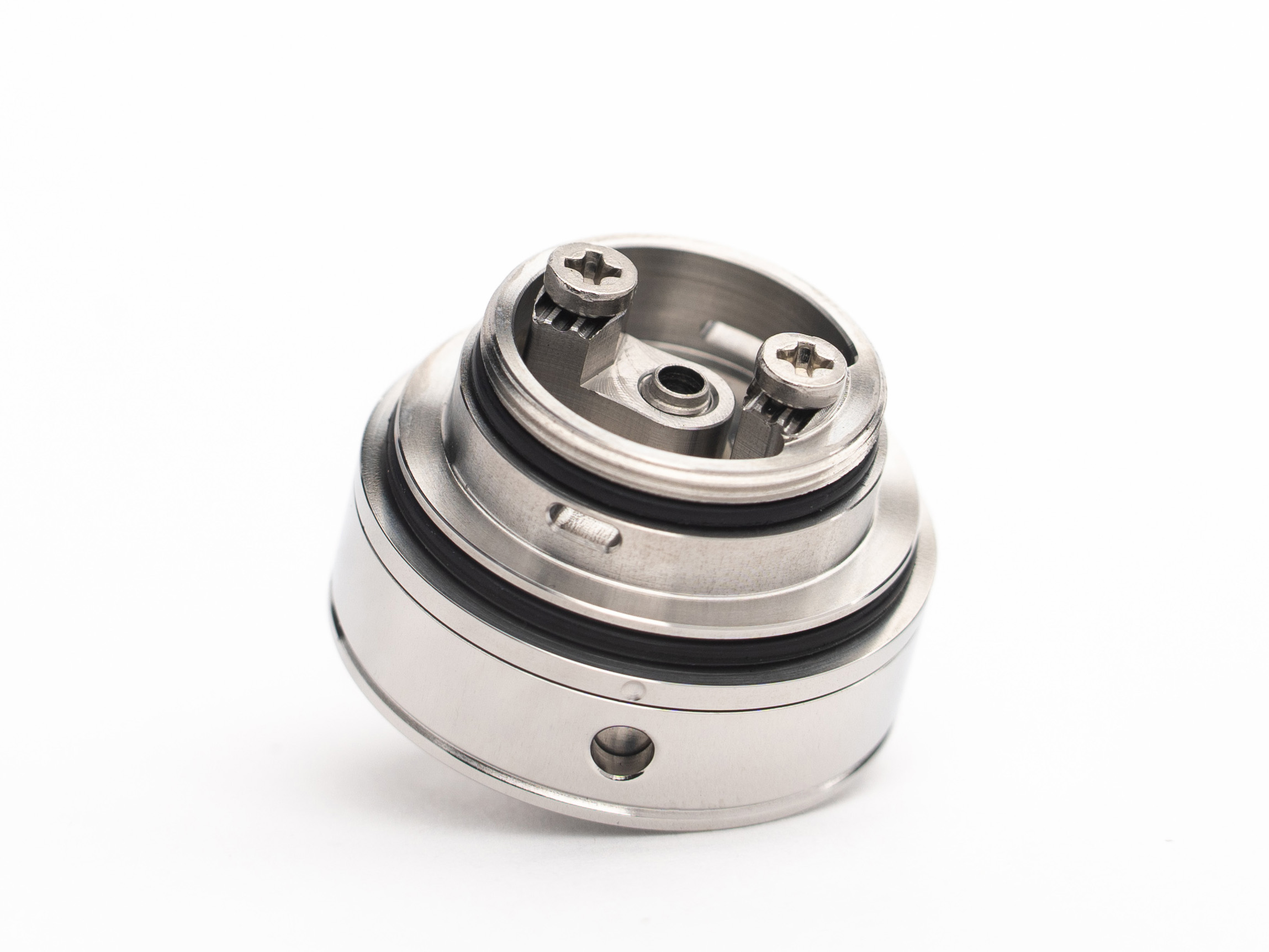 Под куполом располагается привычная база с двумя коренастыми стойками по бокам и емкой ванночкой. Ножки спирали следует горизонтально разместить на платформах и прижать сверху винтами с крестовыми шлицами. За нижний обдув намотки отвечает небольшое круглое отверстие на дне деки. Интенсивность затяжки можно настроить при помощи вращающегося кольца и множества разнокалиберных отверстий. В дополнение ко всему, предусматриваются два различных купола с альтернативными испарительными камерами, разных форм о объемов. Заправка осуществляется снизу.