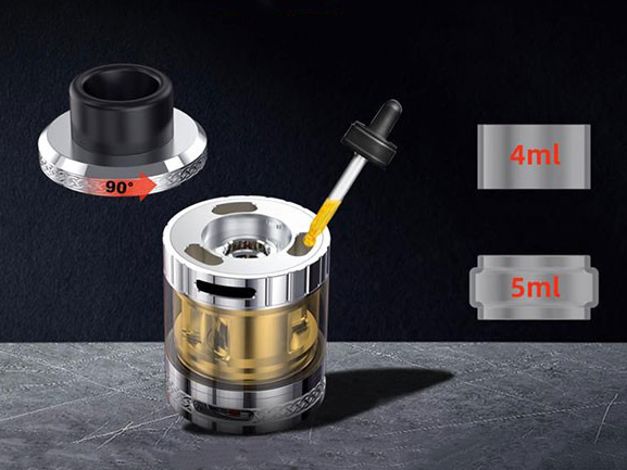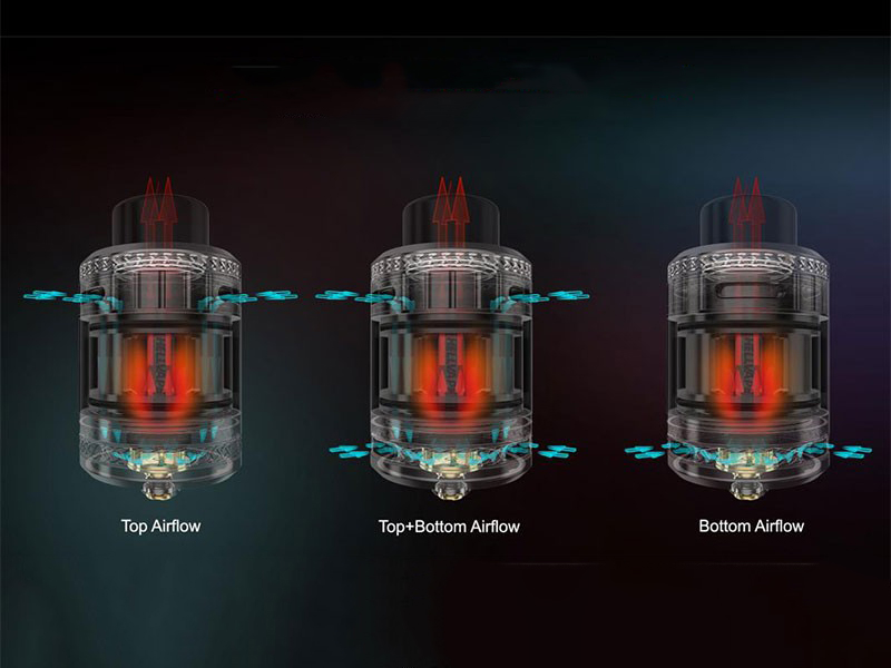 Под куполом, на необслуживаемой базе восседает предустановленный сеточный испаритель на 0,15 Ом. Кроме того, в резерве предусматривается альтернативный экземпляр на сетке с сопротивлением в 0,2 Ом. Воздушные потоки подаются сверху и снизу, через сепарированные каналы. За детальную настройку затяжки отвечают два вращающихся кольца. Стандартную цилиндрическую колбу можно заменить расширенной версией на 5 мл.