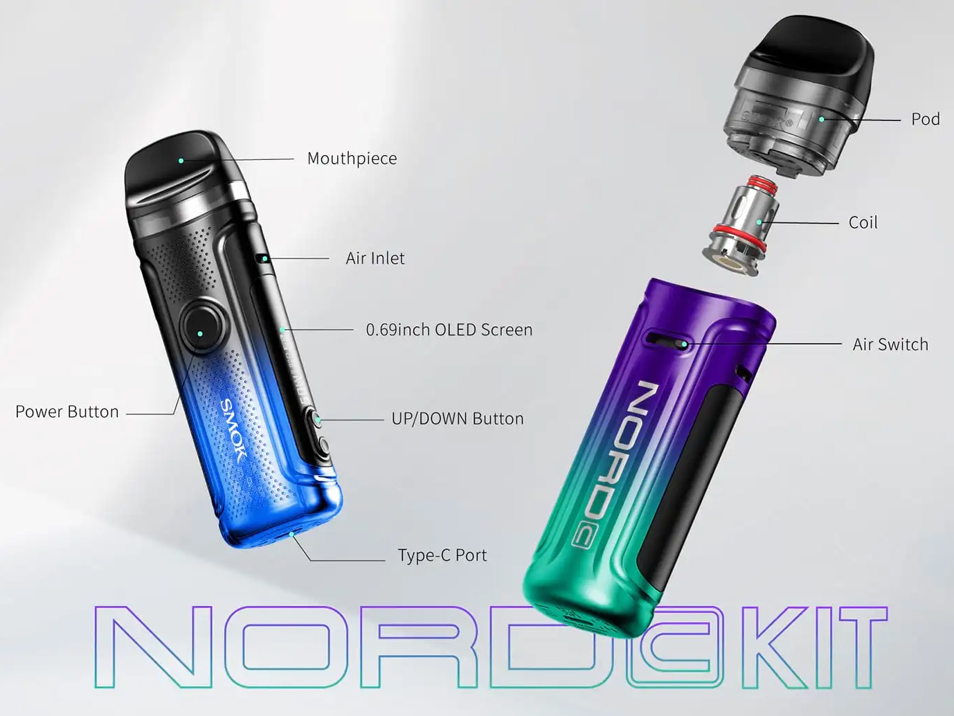 9 апреля в ряде интернет-магазинов появился портативный девайс — Nord C Pod Kit, разработанный компанией Smok. Новую под-систему облачили в небольшой цинковый корпус с эргономичной формой. Гамму расцветок собрали из восьми оригинальных градиентных вариаций. Сверху усадили магнитный картридж с крупным прозрачным резервуаром и широким съемным дриптипом, отвечающим за доступ к заправочным отверстиям. Фасад украсили множеством мелких перфораций и отметили круглой кнопкой зажигания. На обороте сделали вытянутое воздушное отверстие с ползунком. Вдоль одного из торцов растянули монохромны дисплей и пару регулировочных клавиш. Дно снабдили USB-портом.