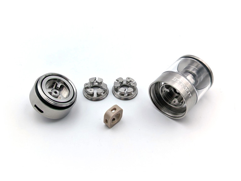 Внутри скрывается нетривиальная база, состоящая из термостойкого изолятора и двух платформ со стойками, отвечающими за укладку трех концов хлопка и установку спирали. Намотка будет вертикально располагаться в образовавшемся колодце, по центру. Для настройки интенсивности обдува предусматриваются четыре разнокалиберные перфорации. Резервуар вмещает 3,2 мл жидкости. Заправка осуществляется по старинке — через дно.