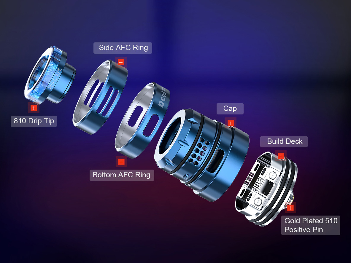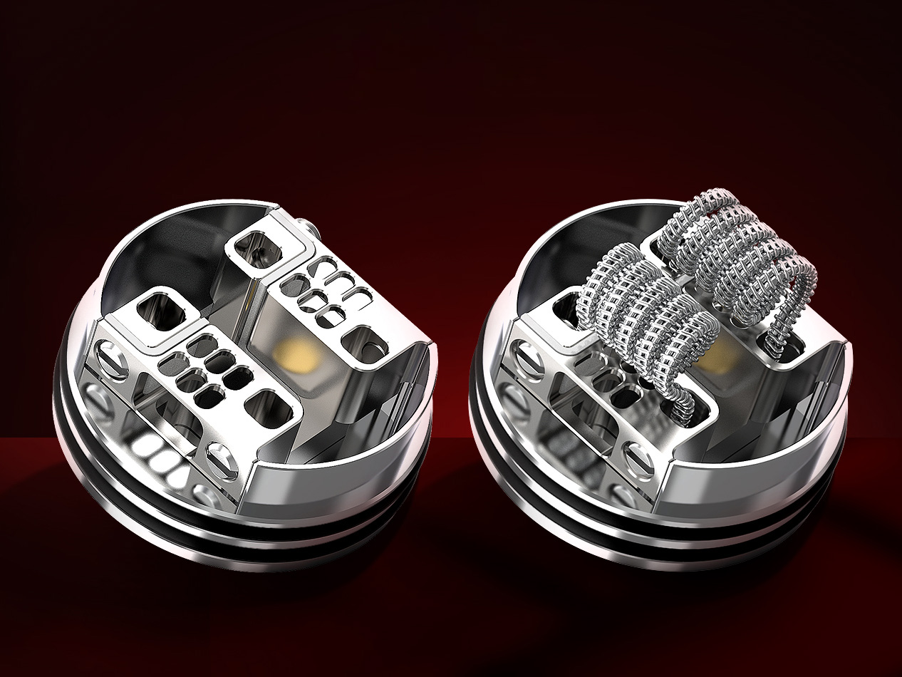 Внутри находится просторная двухстоечная база без стоек, но с четырьмя квадратными слотами, располагающимися на бортах. Ножки спиралей устанавливаются сверху вниз и фиксируются боковыми винтами под прямую отвертку. Воздушные потоки будут поступать на раскаленную намотку через два сепарированных канала — снизу и с боков. Настройка обдува осуществляется при помощи пары сменных вращающихся колец с разнообразными воздушными формациями для наибольшей вариативности. Помимо стандартного пина 510, предусматривается вариант для работы со сквонкерами.