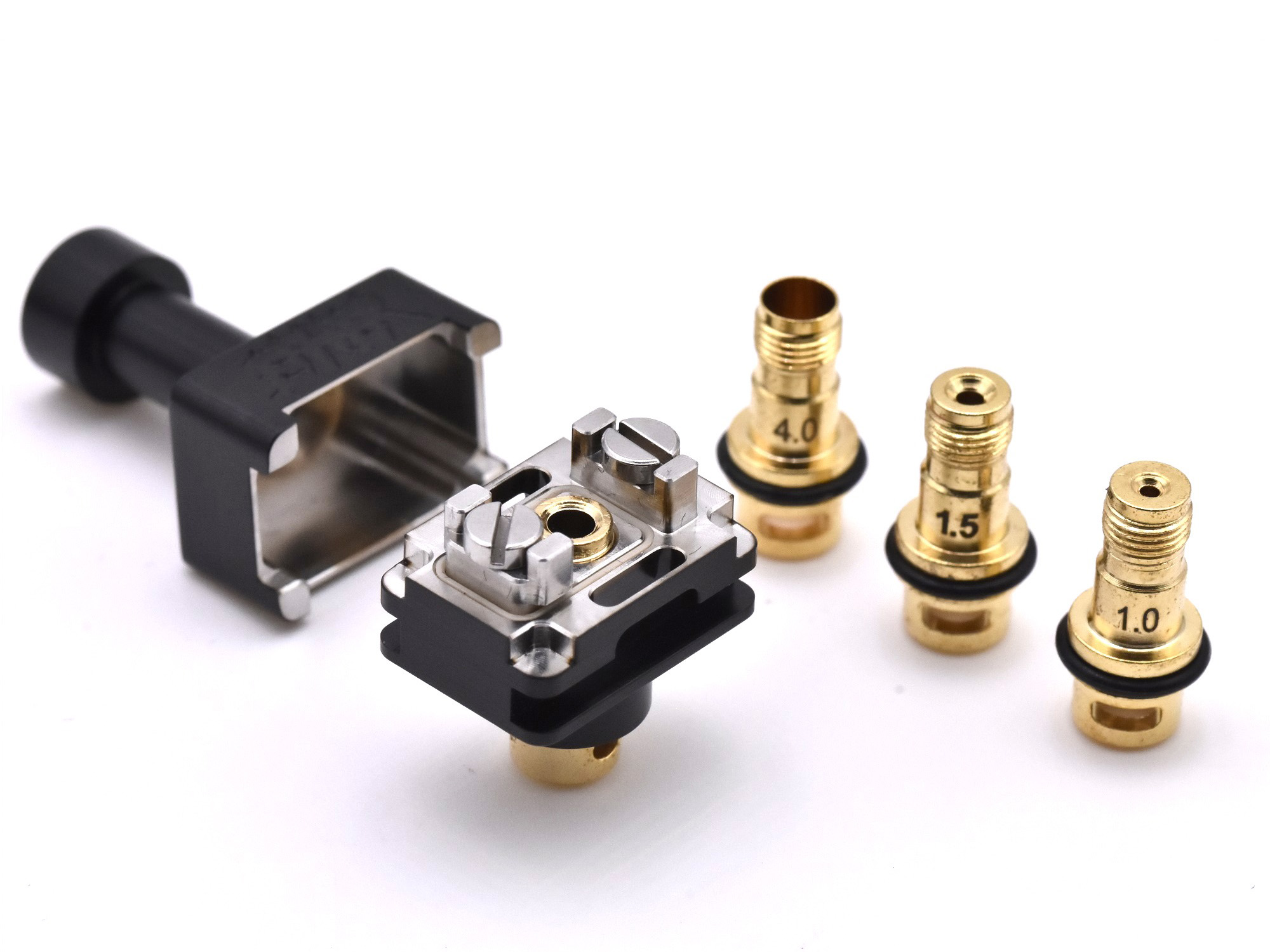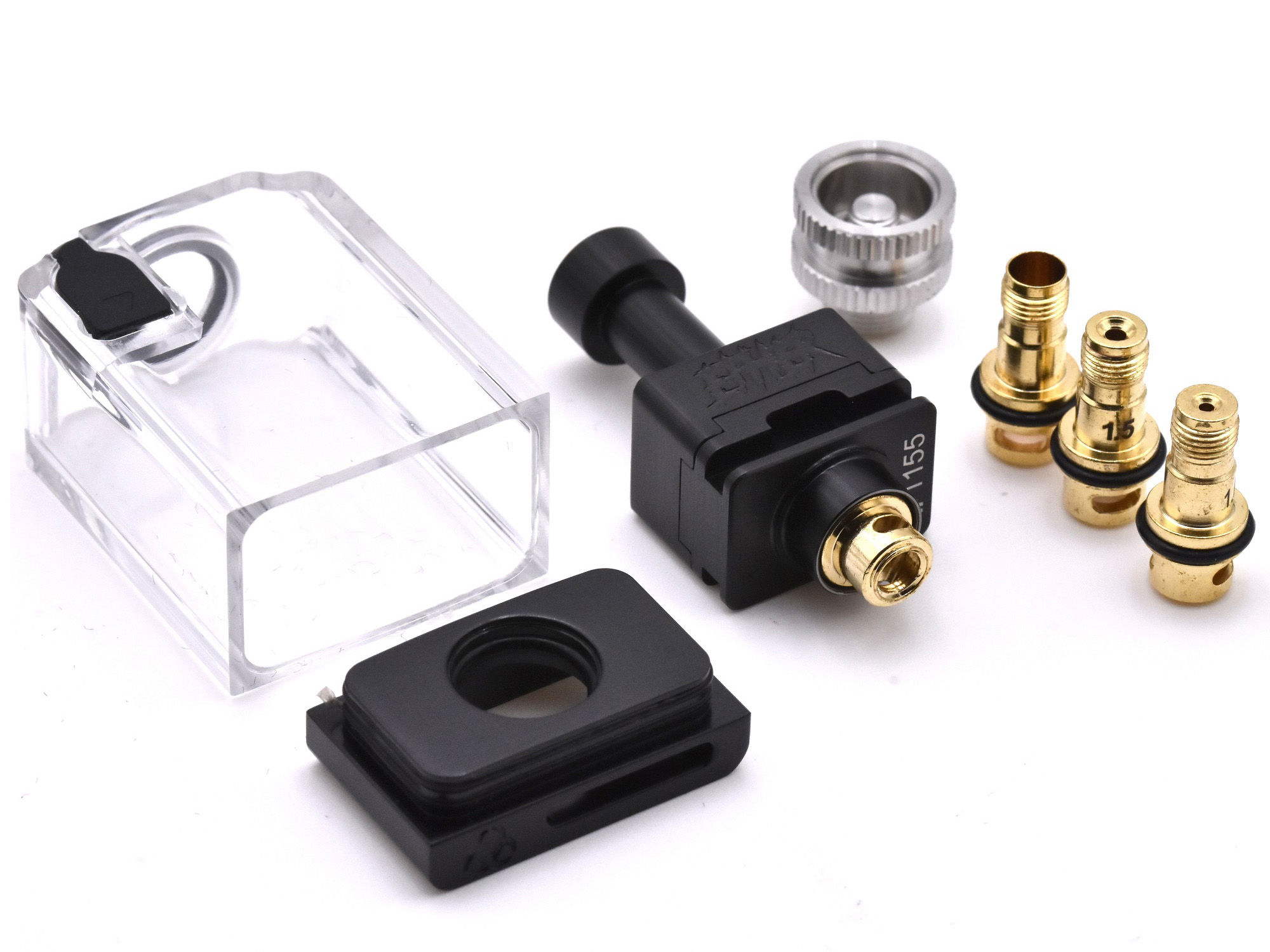 Под куполом находится привычная съемная база с двумя широкими стойками, отвечающими за фиксацию одной спирали. Ножки намотки будут располагаться на широких платформах с бортами и прижиматься сверху винтами под прямую отвертку. По бокам предусматриваются небольшие емкости для укладки концов хлопка. Воздушный поток подается на спираль снизу, через сменную позолоченную вставку, реализованную сразу в четырех разнокалиберных экземплярах для обеспечения вариативности обдува. Объем резервуара составляет 5 мл.