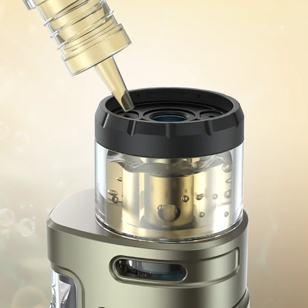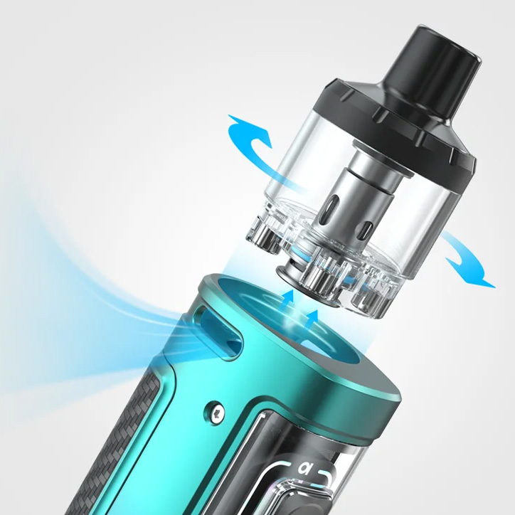 Максимальная мощность на выходе составляет 100 ватт. Кроме того, устройство может функционировать в режимах температурного контроля, Bypass и Auto. Доступное сопротивление варьируется в диапазоне от 0,08 до 3,5 Ом. В качестве источника питания можно использовать три формата батарей — 21700, 20700 и 18650. Для быстрой зарядки током в 2А предусматривается USB Type-C. Картридж поддерживает семь видов сменных испарителей, однако, стандартный набор ограничится двумя вариантами на 0,15 и 0,3 Ом. Бак заправляется сверху, через отверстие под съемной крышкой. Объем резервуара составит 5 либо 2 мл в зависимости от версии. Затяжка настраивает путем вращения картриджа относительно мода.