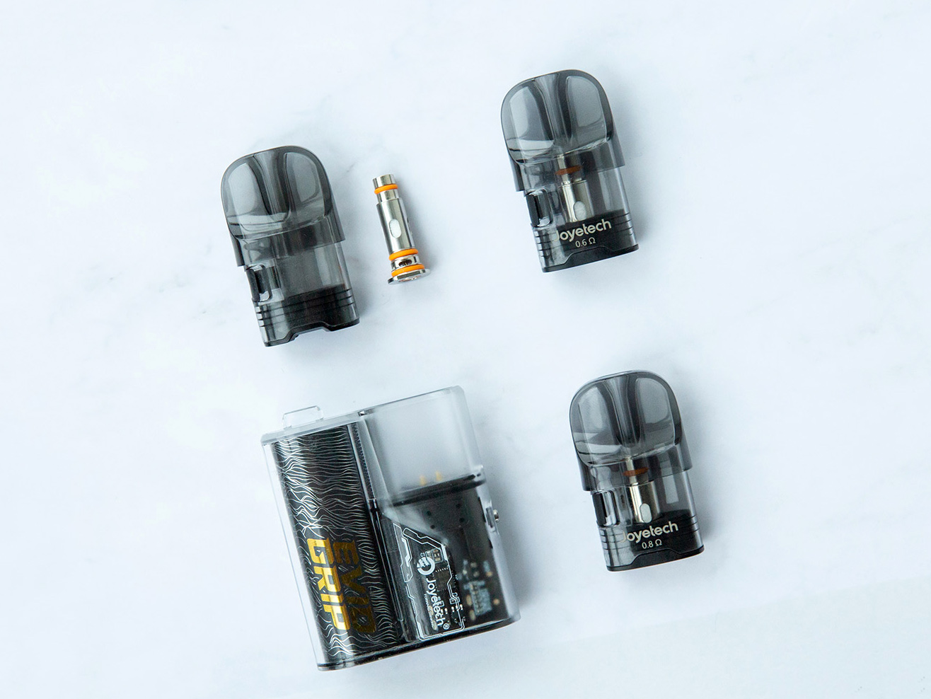 Компания Joyetech выпустила Evio Grip Pod Kit. Устройство отличилось экстравагантным миниатюрным корпусом с регулируемым обдувом, парой картриджей под различные виды испарителей и максимальную мощность в 20 ватт.
