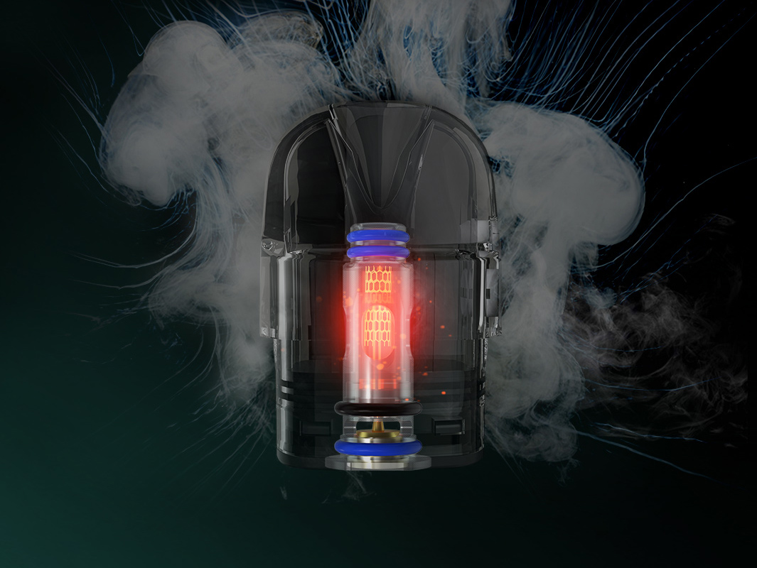 Под-система питается от встроенного аккумулятора с запасом в 800 мАч и выдает максимальную мощность в пределах до 15,3 ватт. Уровень оставшегося заряда отображается зеленым, синим и красным цветом по мере убывания. Зарядку надлежит производить через USB Type-C. Зажигание происходит в процессе затягивания. Два сменных картриджа из новой серии обеспечиваются натуральным хлопком чайного дерева, различными сетками на 0,8 и 1,0 Ом, а также запатентованной фирменной технологие FM SaltCoilTech 4.0 для наилучшей вкусопередачи. Бак отличается увеличенной емкостью 3 мл и доступным заправочным отверстием, находящимся на боковине резервуара, под откидной заглушкой.
