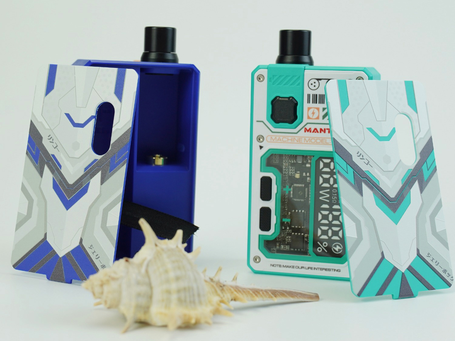 За управление и безопасность экстраординарного устройства отвечает усовершенствованная плата Manto 2.0, поддерживающая вариативный разноцветный интерфейс, надежную систему безопасности и регулируемую мощность в пределах от 10 до 80 ватт. Доступное сопротивление ограничивается диапазоном от 0,1 до 3,0 Ом. За питание отвечает внешняя батарея формата 18650. Для зарядки током в 1А, а также возможности обновления прошивки платы предусматривается USB Type-C. Универсальный картридж может работать как со сменными испарителями, так и с обслуживаемой базой. Комплектная RBA обладает привычной конструкцией, включающей две стойки под одну спираль. Пара фирменных испарителей из одноименной серии снаряжается различными сетками с сопротивлением в 0,3 либо 0,15 Ом. Объем бака составит 3,5 мл. В дополнение ко всему, на дне резервуара имеется кольцо для настройки обдува.
