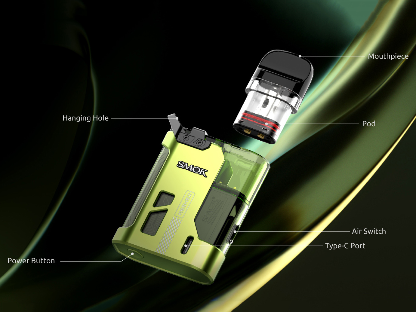 Устройство активируется по затяжке и выдает максимальную мощность в 22 ватт. Сопротивление может варьироваться в диапазоне от 0,6 до 2,5 Ом. Динамическую разноцветную подсветку можно переключать в пределах двух режимов путем двойного нажатия на клавишу включения. Емкость аккумулятора составляет 700 мАч. Полный цикл зарядки через USB Type-C потребует не более одного часа. Картридж реализуется в двух экземплярах с разными встроенными сеточными испарителями на 0,6 и 0,8 Ом. Кроме того, девайс совместим с другими вариантами из серии Novo. Бак обладает удобной верхней заправкой и стандартным объемом в 2 мл.