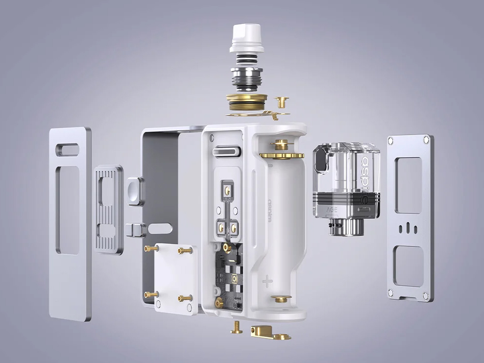 19 сентября компания Aspire представила на странице в фейсбуке all-in-one устройство — Raga AIO Kit. Универсальный портативный мод выполнили из алюминиевого сплава и термопластика в виде лаконичного прямоугольника со скругленной тыльной стороной. Верхнюю площадку увенчали приплюснутым мундштуком с металлическим основанием, фиксирующим бак внутри устройства. Широкие торцы накрыли съемными магнитными панелями. Одну из боковин укомплектовали кнопкой активации и парой маленьких регулировочных клавиш. На противоположной стороне разместили отсек с баком и монохромный дисплей. Аккумуляторное ложе избавили от крышки и снабдили вращающейся шестеренкой, отвечающей за подстройку высоты.