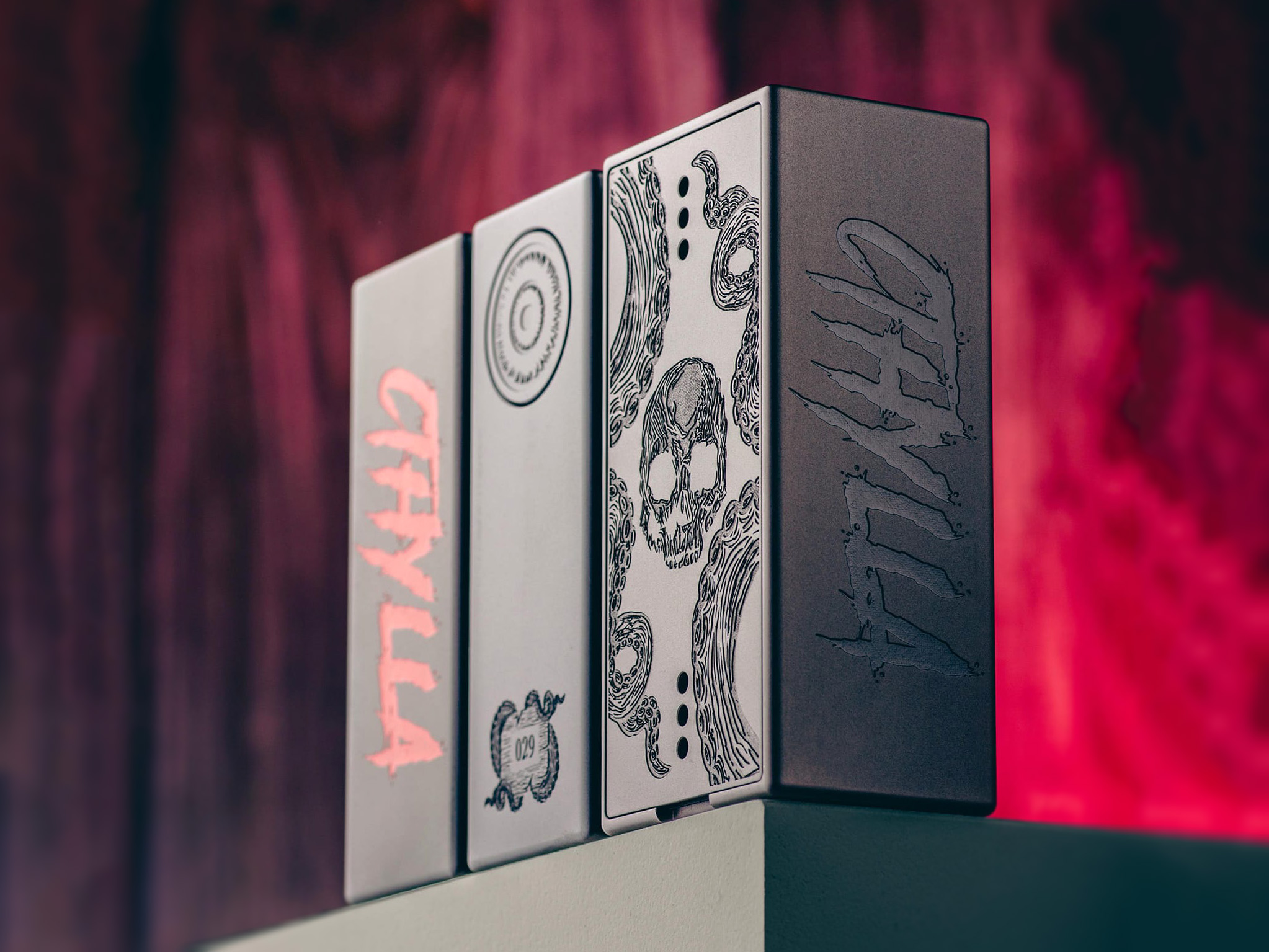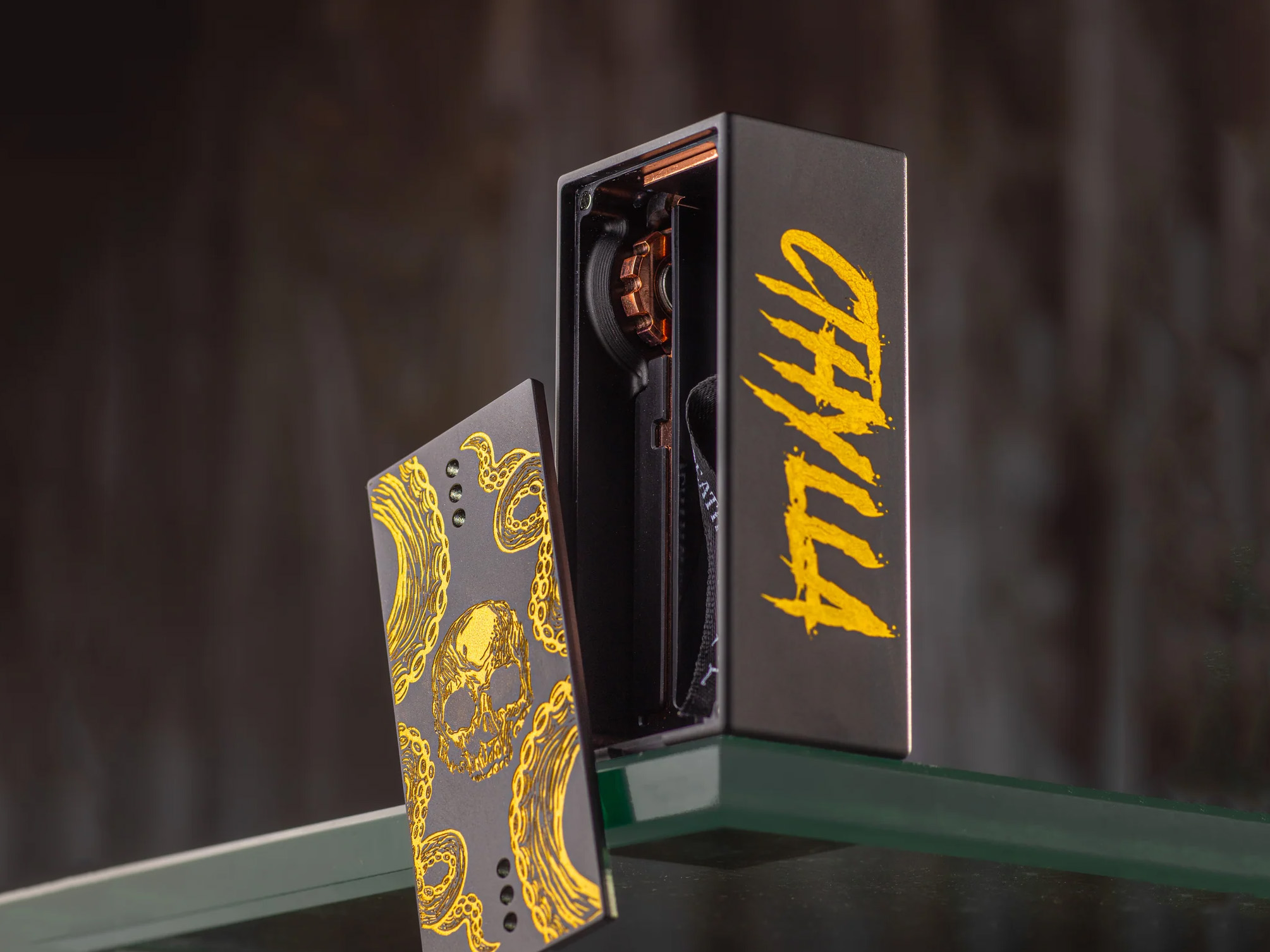 13 октября компания Deathwish Modz представила на странице в фейсбуке новый девайс — Cthylla Mech Mod. Нетривиальный механический мод облачили в строгую прямоугольную форму с острыми гранями. Не смотря на массивный вид, устройство обладает не слишком большим весом, за счет алюминиевого сплава в качестве основного материала. На выбор предлагается шесть цветовых вариаций. Посадочную площадку снабдили гибридным коннектором, сместили к тыльной стороне и наделили солидным диаметром в 30 мм. На лицевой стороне установили крупную гравированную кнопку активации. Противоположную сторону накрыли съемной панелью с вентиляционными перфорациями и оригинальной резьбой. Широкие боковины также украсили рельефной гравировкой с контрастным окрасом.