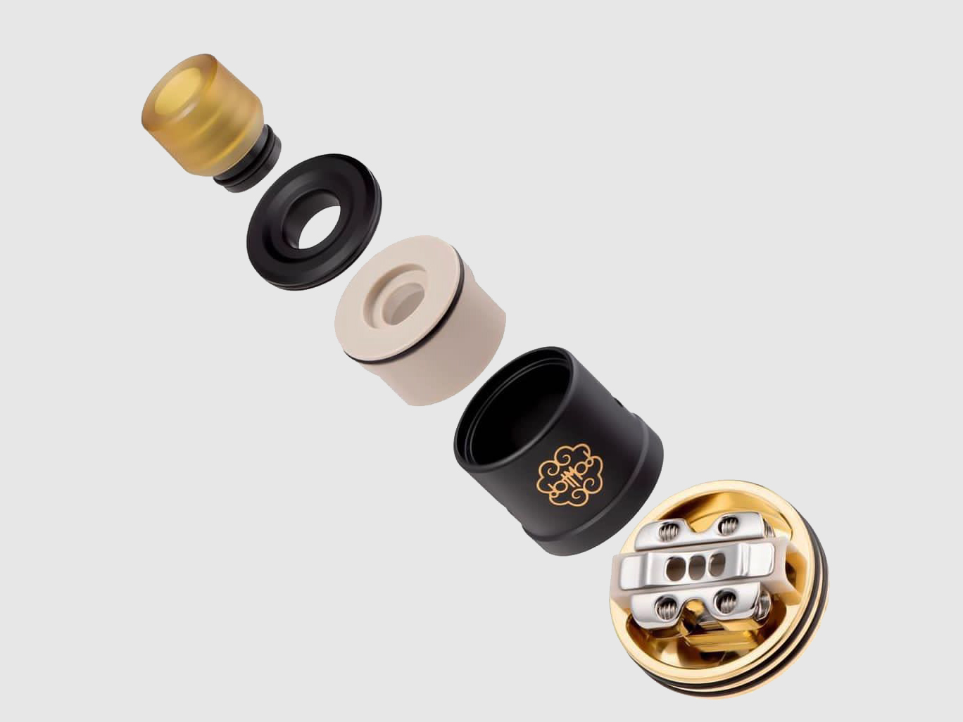 В комплект поставки входят два дриптипа, два топкепа, два купола, две воздушные вставки, запасные детали, триммер, BF-пин, отвертка и инструкция.