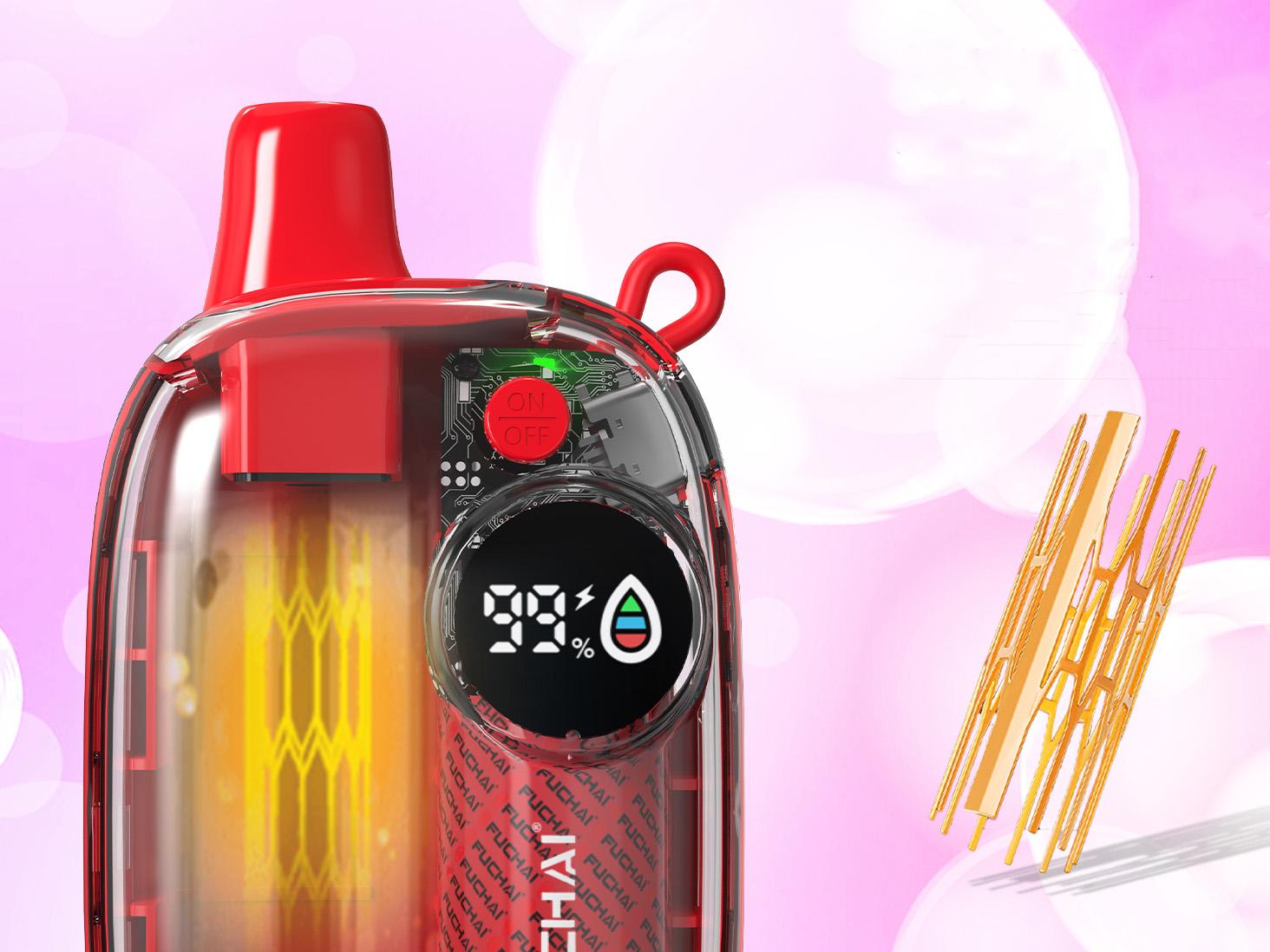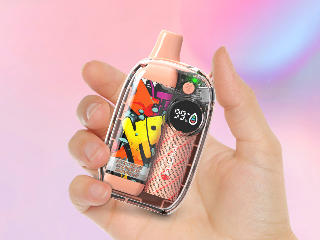 Осенью 2023 года китайская компания Sigelei представила на своем сайте нетривиальный одноразовый девайс — Fuchai 10000 Puffs. Под-систему облачили в яркий миниатюрный корпус с плавным скругленным силуэтом и прозрачными боковыми панелями. Верхушку увенчали эргономичным мундштуком и петлей для крепления ремешка. На широкой лицевой стороне установили необычный крупный дисплей и кнопку переключения. Под прозрачными полимерными стенками разместили украшенный бак, батарею и небольшую плату с цветным индикатором. Срезанное дно дополнили зарядным портом.