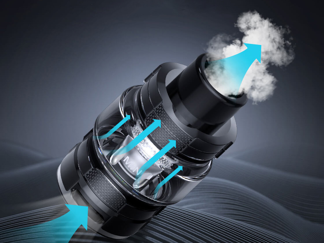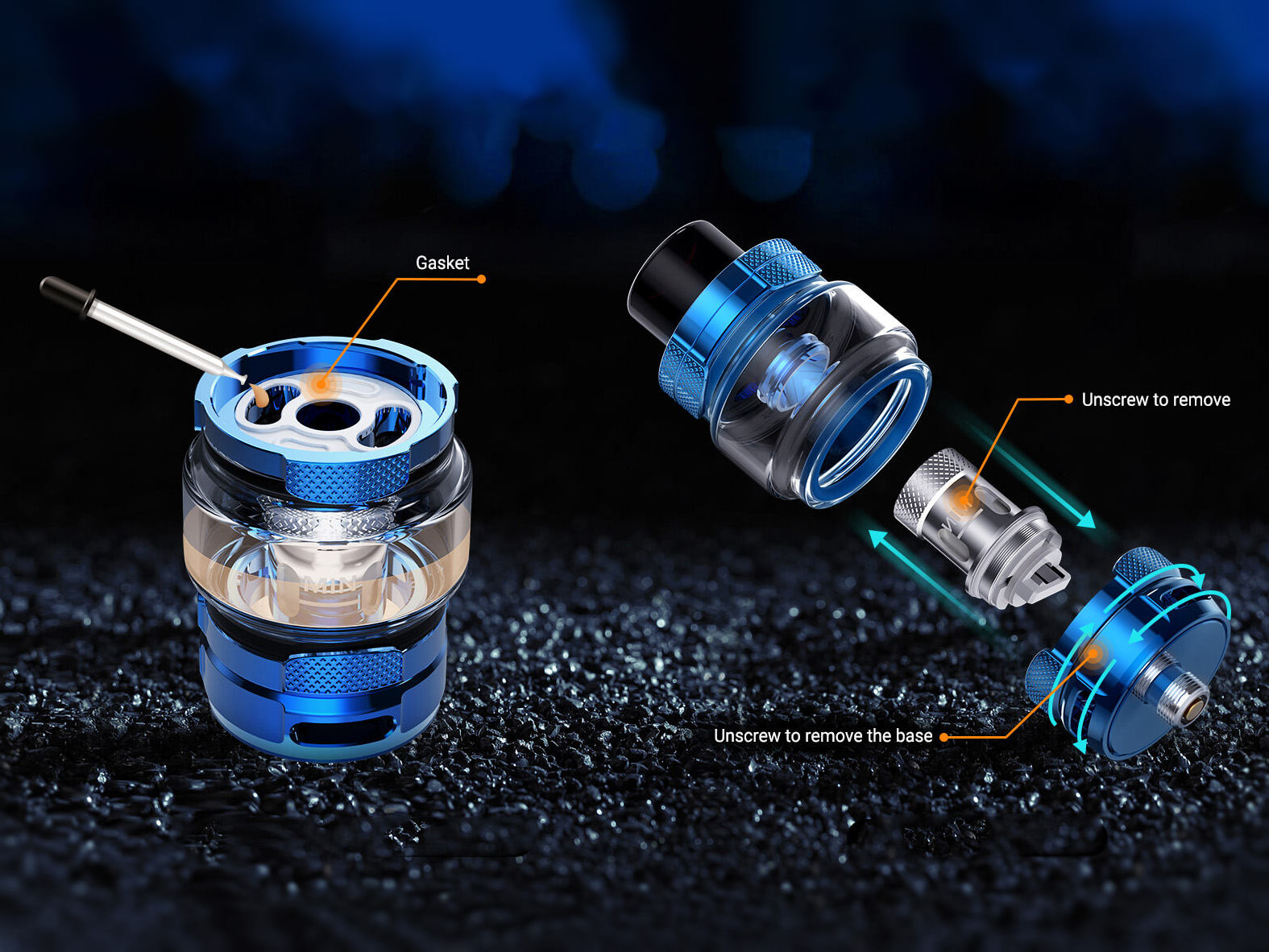 Внутри бака находится предварительно установленный сеточный испаритель M8 на 0,15 Ом. Помимо того, в запасе предусматривается дополнительный экземпляр M6 с аналогичным сопротивлением в 0,15 Ом, но альтернативной плетенной сеткой. В дополнение ко всему, универсальная база поддерживает еще восемь сменных вариантов из других фирменных серий. Закаленную цилиндрическую колбу на 3,5 мл можно заменить расширенной версией с объемом 5 мл. Обдув регулируется с помощью привычного вращающегося кольца.