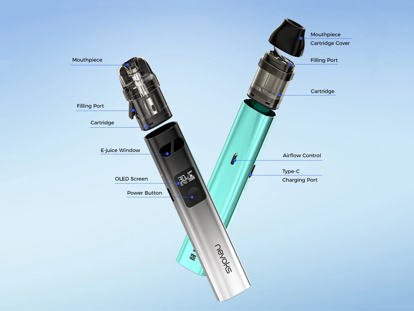 Под-система питается от интегрированного аккумулятора на 1000 мАч и выдает мощность в диапазоне от 5 до 30 ватт. Помимо монохромного дисплея, плата предусматривает доступ по отпечатку пальцев. В качестве картриджей предлагается использовать фирменную линейку A1, включающую шесть различных экземпляров со встроенными испарителями. Базовый набор ограничивается двумя вариантами с сопротивлением в 0,4 и 0,6 Ом. Объем бака в обоих случаях составит 3 мл. Интенсивность обдува можно настраивать при помощи ползунка на тыльной стороне.