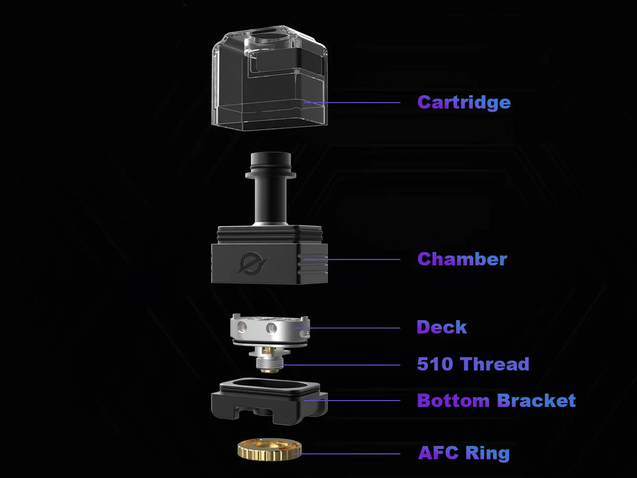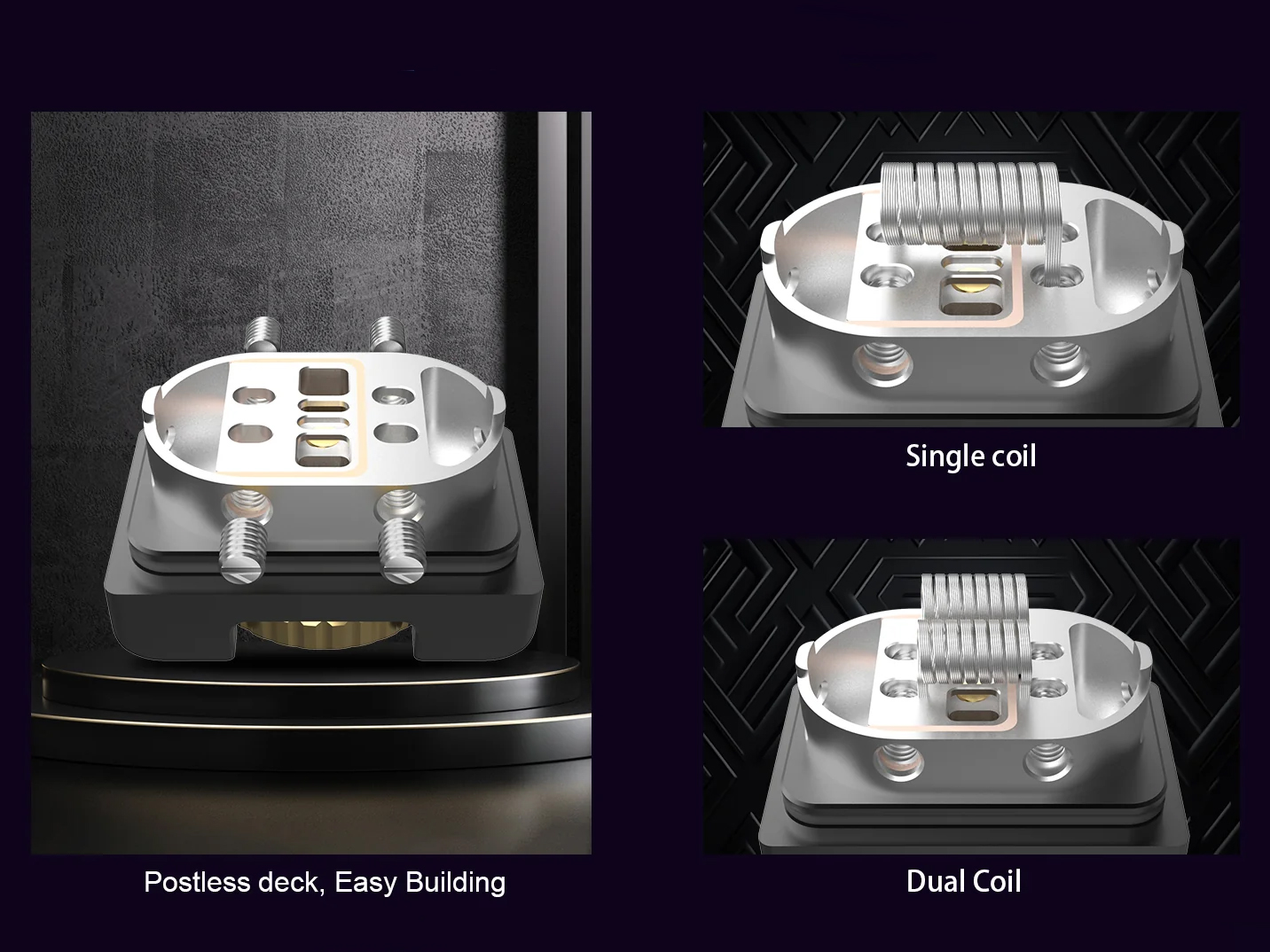 Под куполом располагается вместительная база без стоек с четырьмя слотами для установки одной либо двух спиралей. Ножки намотки располагаются в вертикальной плоскости и зажимаются позолоченными боковыми винтами с шестигранными шлицами. Воздушные потоки подаются на спираль снизу и регулируются при помощи вращающегося кольца. Под базой предусматривается встроенный коннектор 510. Резервуар вмещает 4 мл жидкости.