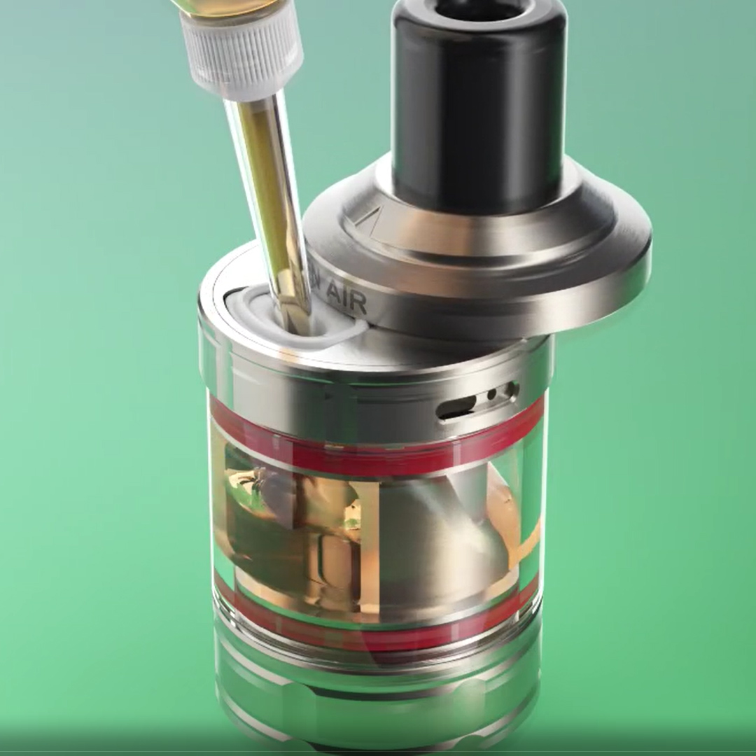 Бак получил сдержанный стальной корпус, оформленный в черном либо серебристом варианте с узким посадочным диаметром в 22 мм. Объем можно увеличить с 2 до 3,5 мл при помощи дополнительной расширенной колбы. Заправочное отверстие скрывается под удобной сдвигающейся крышкой. Сверху восседает классический дельриновый дриптип формата 510. Вращающееся воздушное кольцо находится сверху, обеспечивая надежную защиту от протечек. Внутри находится предустановленный сеточный испаритель на 0,8 Ом из новой одноименной линейки. Кроме того, в запасе предусматривается альтернативный вариант с сопротивлением в 1,2 Ом.