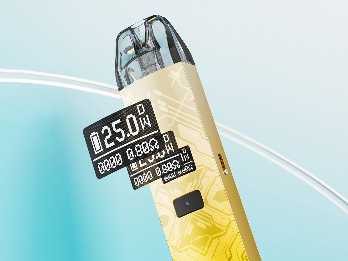 Внутри находится стандартный встроенный аккумулятор на 1000 мАч, а также регулируемая плата с лаконичным интерфейсом и диапазоном работы от 5 до 25 ватт. За зарядку отвечает USB Type-C, уровень заряда отображается зеленым, синим и красным цветом по мере убывания. В качестве сменных картриджей доступны три разнообразных экземпляра с интегрированной намоткой на 1,2; 0,8 и 0,6 Ом. Тем не менее, базовый комплект ограничивается только последним вариантом. Бак заправляется через боковую стенку и вмещает 3 мл. Обдув настраивается ползунком.