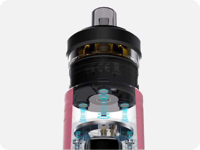 За безопасность девайса отвечает регулируемая плата с лаконичным монохромным интерфейсом и вариативной мощностью в пределах от 6 до 25 ватт. В качестве источника питания выступает емкая встроенная батарея на 1300 мАч. Зарядка осуществляется через USB Type-C током в 0,75А. Картридж отличается вместительным резервуаром на 4,5 мл и поддержкой четырех видов сменных испарителей из фирменной линейки PZP coil. В основной набор войдут два экземпляра с сопротивлением в 0,6 и 1,2 Ом под свободную либо тугую затяжку. Настроить обдув можно путем вращения бака относительно мода. Заправка производится через дно картриджа.