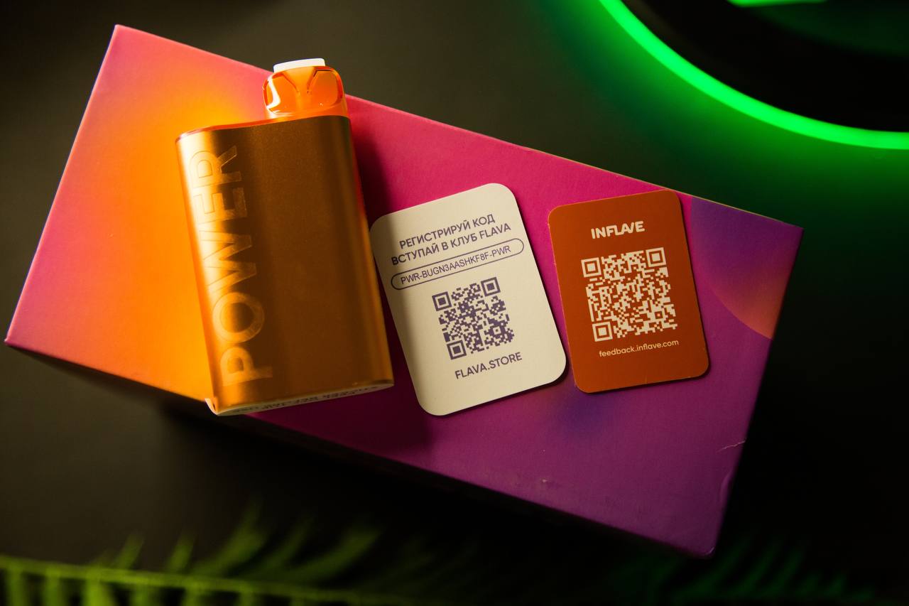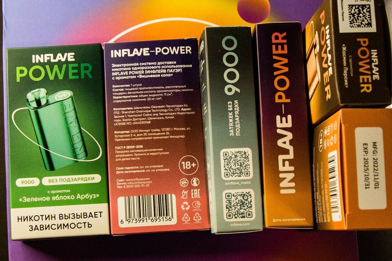 Серия вкусов INFLAVE POWER поставляется в ярких картонных коробках. Цветовая гамма оформления и цвет устройства на изображении зависит от выбранного сочетания. На лицевой стороне расположено название линейки, название вкуса на русском языке, количество затяжек, пометка о том, что устройство не нуждается в подзарядке и предупреждение на белом фоне. На торцах дублировано название серии и расчетный объем тяг, а также находятся QR-коды, ведущие на интернет-ресурсы производителя. Информационный блок расположен на обратной стороне упаковки – описание продукта, состав, характеристики, юридические данные, предупреждения, маркировки, контактная информация и штрихкод. На верхней крышке помещена информация о линейке и вкусе, а также маркировка Честный Знак. На нижней – дата производства со сроком годности.