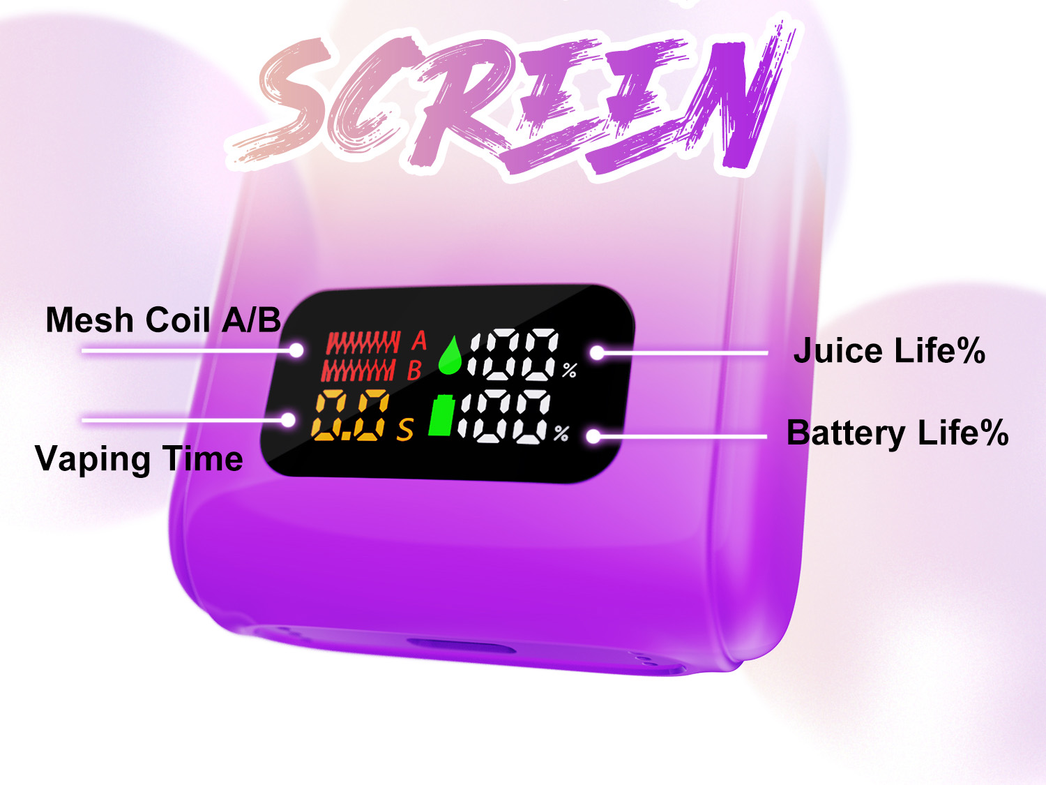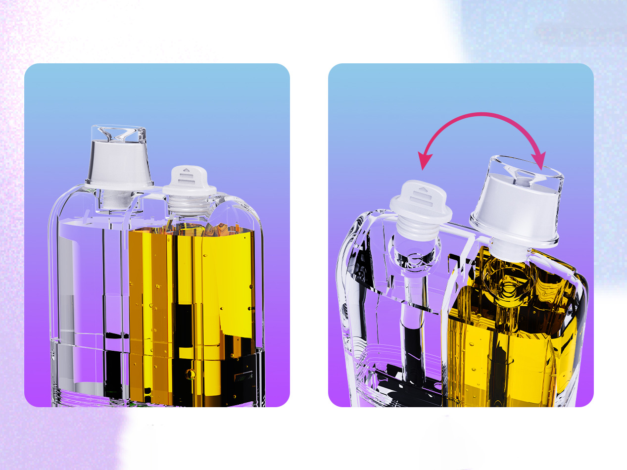Зажигание осуществляется при помощи стандартного воздушного активатора. Источником питания выступает встроенный аккумулятор с запасом в 650 мАч и зарядным портом USB Type-C. Главной особенностью девайса является наличие сразу двух сепарированных картриджей с интегрированными сеточными испарителями на 0,8 Ом и большими резервуарами емкостью 15 мл каждый. Для переключения между баками достаточно поменять местами мундштук и заглушку. Концентрация никотина в предзаправленной жидкости составляет 50 мг/мл. Информативный цветной интерфейс отображает уровень жидкости, заряд батареи, состояние намотки и общее время парения.