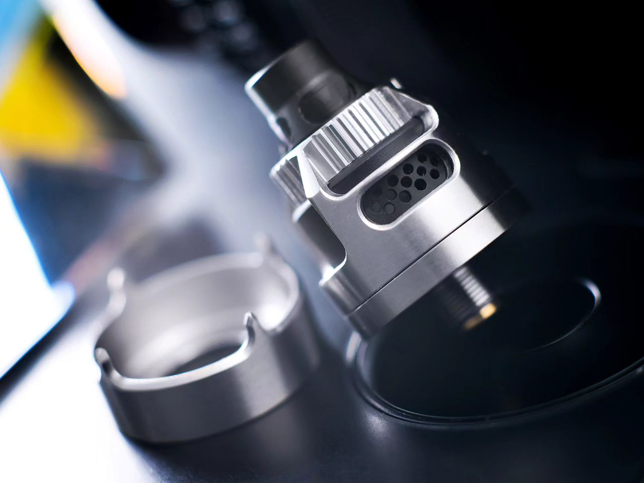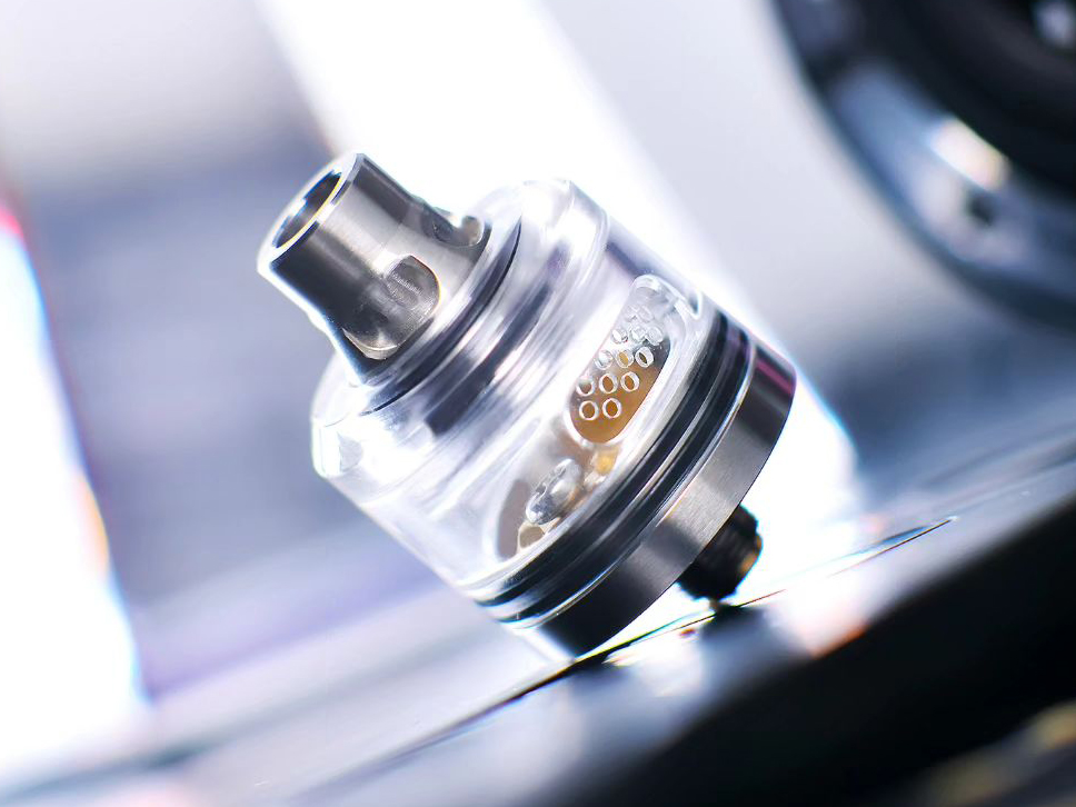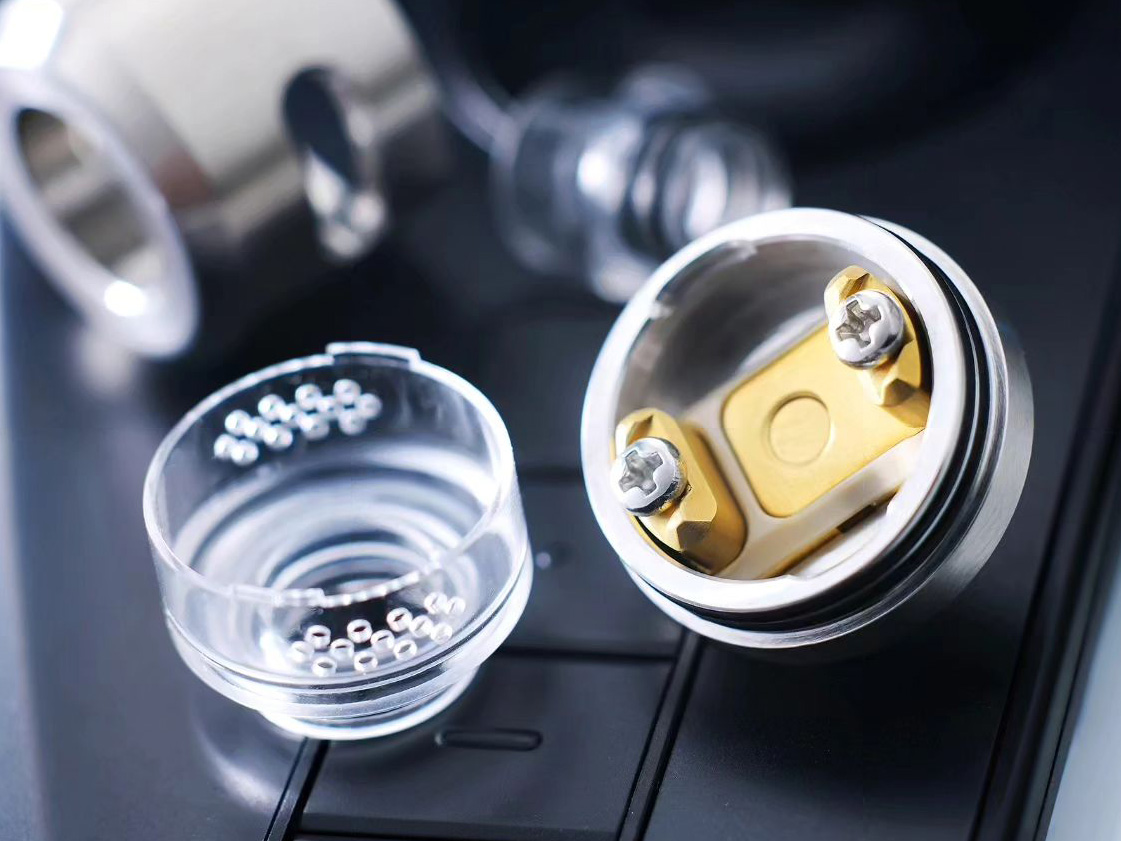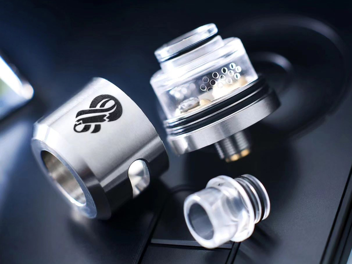 Внутри находится дополнительная внутренняя юбка, участвующая в боковом обдуве намотки и сокращающая объем испарительной камеры для лучшей вкусопередачи. По бокам просторной базы располагаются две позолоченные стойки, отвечающие за установку одной спирали. Ножки следует горизонтально разместить на платформах с небольшими бортами и прижать верхними винтами с крестовыми шлицами. Затяжка регулируется путем вращения внешнего купола относительно внутреннего с множеством мелких круглых перфораций. Помимо стандартного пина, предусматривается экземпляр для нижней подачи жидкости.