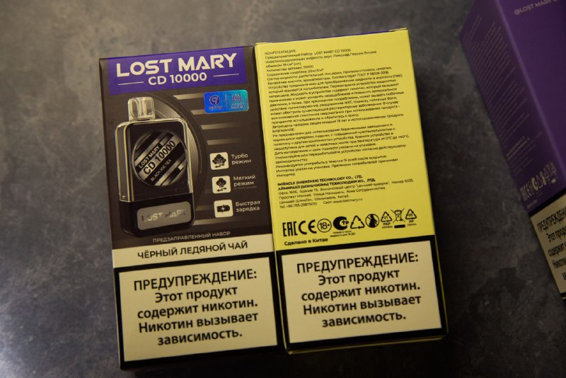 Серия вкусов Lost Mary CD10000 поставляется в матовых картонных коробках. Цветовая гамма оформления и цвет устройства на изображении зависит от выбранного сочетания. На лицевой стороне расположены логотип производителя с названием линейки, название вкуса на русском языке, основные характеристики, изображение девайса и предупреждение на белом фоне. На торцах помещены контактные данные производителя, штрихкод, наклейка для проверки подлинности устройства и дата производства со сроком годности. Информационный блок расположен на обратной стороне упаковки – комплектация, характеристики, предупреждения, юридические данные и маркировки. На верхней крышке дублирован логотип производителя.