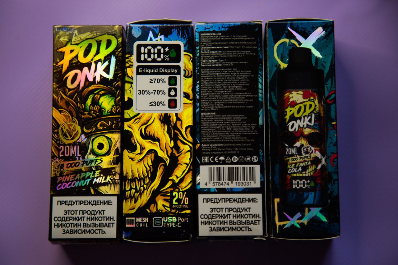 Устройства PODONKI 10000, как всегда, поставляются в ярких и переливающихся картонных коробках. Цветовая гамма оформления и изображения зависят от выбранного сочетания. На лицевой стороне расположено название линейки, название вкуса, расчетное количество затяжек, объем жидкости и предупреждение на белом фоне. Боковые грани отведены под описание работы дисплея, содержание никотина, пометку об использовании сетчатого испарителя и порта для подзарядки USB Type-C, а также изображение самого устройства. С обратной стороны упаковки помещен информационный блок: комплектация, технические характеристики, предупреждения, юридические данные, маркировки и штрихкод. На нижней крышке находится QR-код и дата производства, а на верхней – логотип линейки и название вкуса.