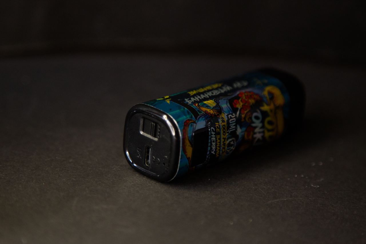 Внутри — девайс в запечатанной прозрачной индивидуальной упаковке. Устройство дополнительно защищено от загрязнения и циркуляции воздуха силиконовой заглушкой и наклейкой. На корпусе находится вся основная информация и экранчик с индикацией заряда аккумулятора и уровня жидкости. На верхней части мода располагается мундштучек, через который выходит пар, а снизу — забор воздуха с регулировкой затяжки и порт Type-C для подзарядки.
