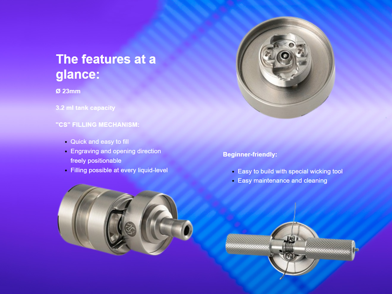 Деку представляют две коренастые стойки, позволяющие зафиксировать одну спираль. Ножки будут располагаться на небольших платформах с ограничителями и фиксироваться крестовыми винтами. Концы хлопка укладываются в емкие боковые ванночки. Воздух будет поступать на намотку снизу, через круглое отверстие в центре базы. Регулировка тугой затяжки осуществляется посредством оригинальной фирменной системы Aerokon, путем вращения пина. Диаметр пропускного канала может составлять от 0 до 1,8 мм. Резервуар заправляется сверху и вмещает 3,2 мл.