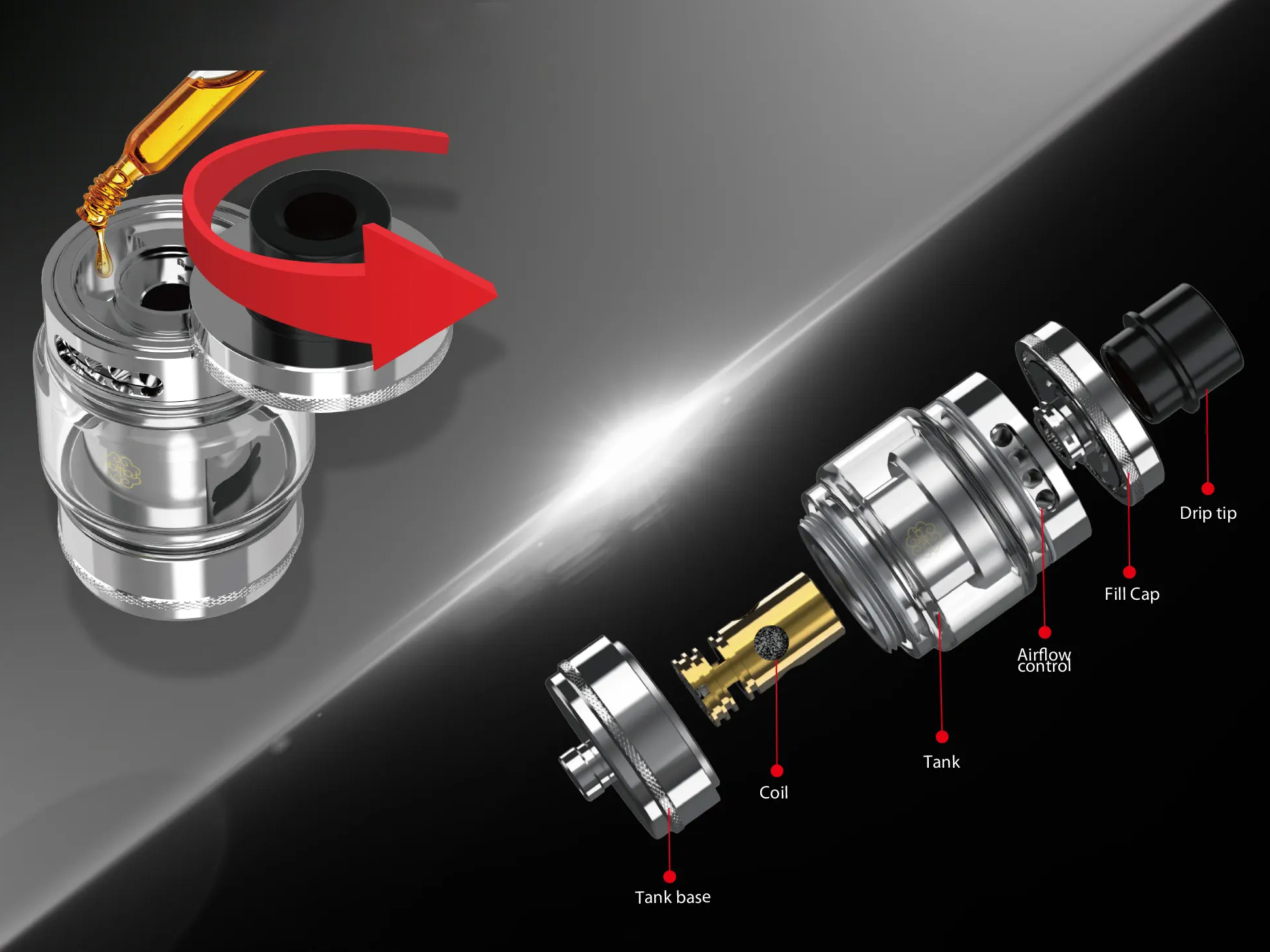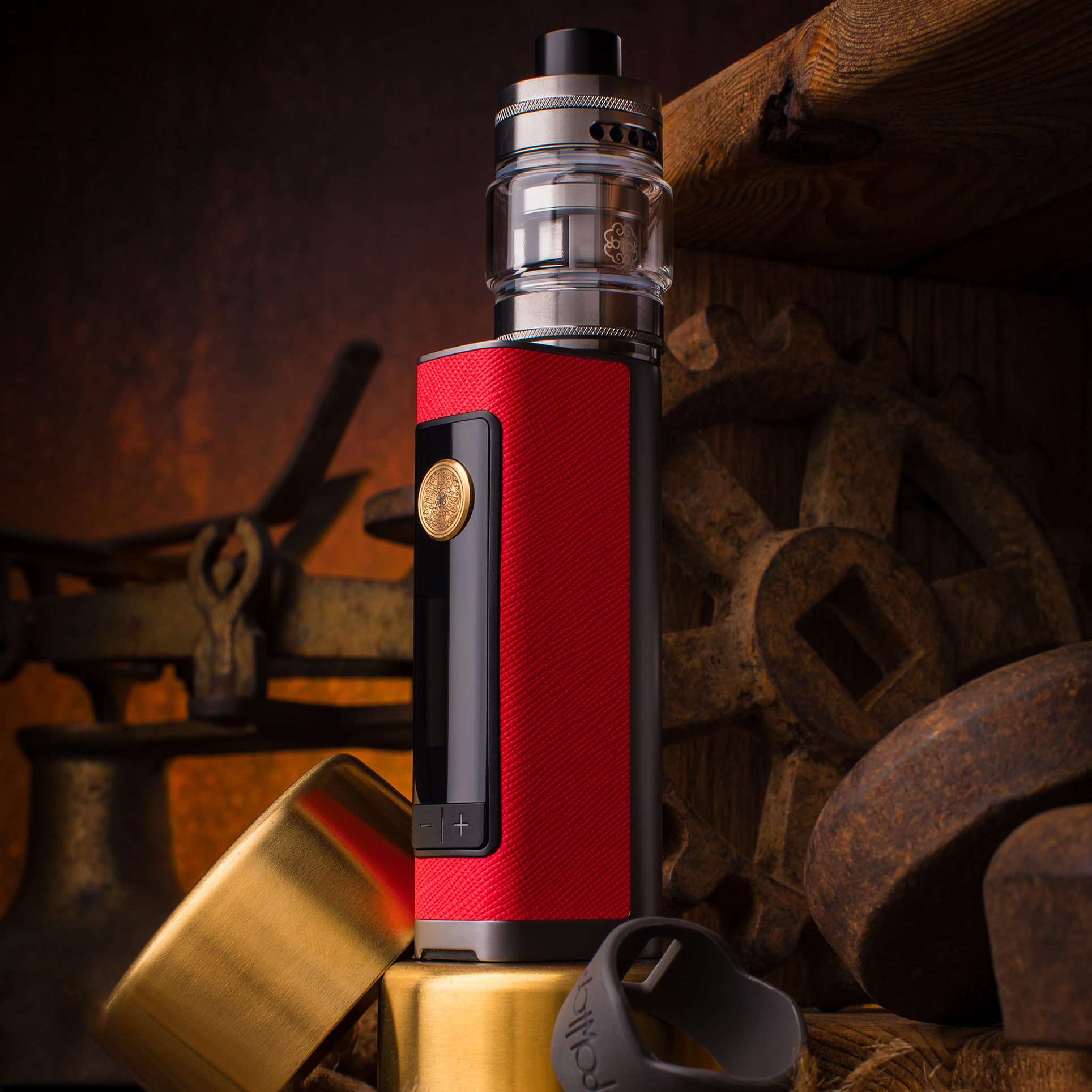 В паре с экстравагантным модом идет бак DotTank с емким резервуаром на 5 мл, а также парой сменных испарителей на 0,15 и 0,3 Ом. Для защиты стеклянной колбы предусматривается съемная силиконовая накладка. Воздухозаборное кольцо находится сверху, обеспечивая надежную защиту от протечек жидкости. Заправочные отверстия скрываются под удобной сдвигающейся крышкой.